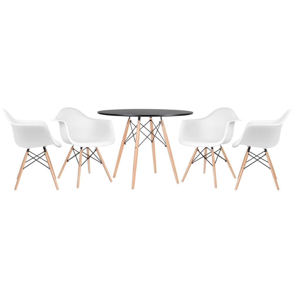 CADEIRAS: Material do assento: Polipropileno - Material da base: Madeira e aço - Altura do encosto: 79,5 cm - Altura do assento: 44 cm - Altura dos braços: 67 cm - Largura total: 62 cm - Profundidade total: 62 cm - Peso suportado: 100 kg.MESA:Material do tampo: MDF laqueado - Material da base: Madeira e aço - Altura: 75 cm - Diâmetro: 100 cm - Garantia: 3 meses.