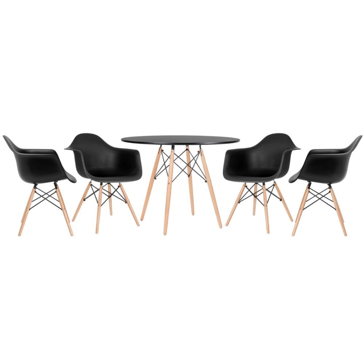 CADEIRAS: Material do assento: Polipropileno - Material da base: Madeira e aço - Altura do encosto: 79,5 cm - Altura do assento: 44 cm - Altura dos braços: 67 cm - Largura total: 62 cm - Profundidade total: 62 cm - Peso suportado: 100 kg.MESA:Material do tampo: MDF laqueado - Material da base: Madeira e aço - Altura: 75 cm - Diâmetro: 100 cm - Garantia: 3 meses.