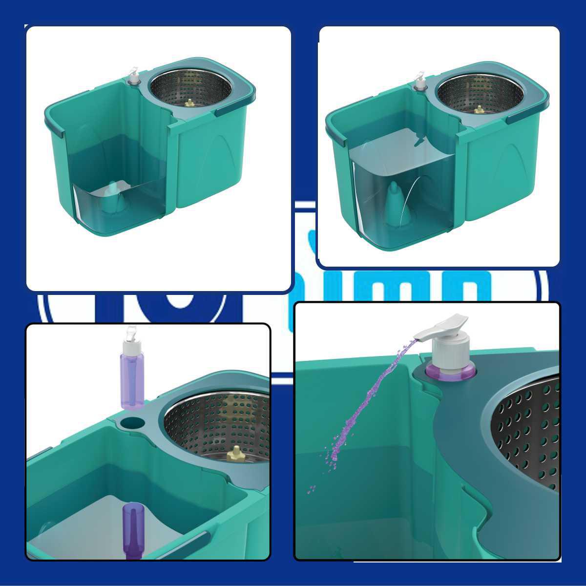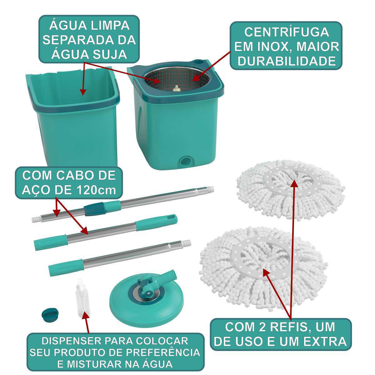 o Mop Giratorio Flash Limp Duas Aguas Pro 6l/9l Com 1 Refil Extra Microfibra E Cabo Aço 128cm É Composto Por Dois Baldes Empilháveis, O Que Garante Economia De Espaço Na Hora De Guardar. Para Usar, Basta Encaixar Um Balde No Outro, Colocar Água No Balde De Enxágue E Ele Está Pronto O Balde De Centrifugação Conta Com Um Cesto De Aço Inox E Uma Tampa Para Facilitar O Escoamento Da Água Ao Término De Sua Utilização. O Conjunto Conta Ainda Com Um Prático Dispenser Para Você Armazenar Seu Produto De Preferência E Misturar Na Água De Enxágue Quando Quiser. O Cabo De Aço Inox É Leve, Resistente E Possui Altura Variável De 104 Cm A 128 Cm.