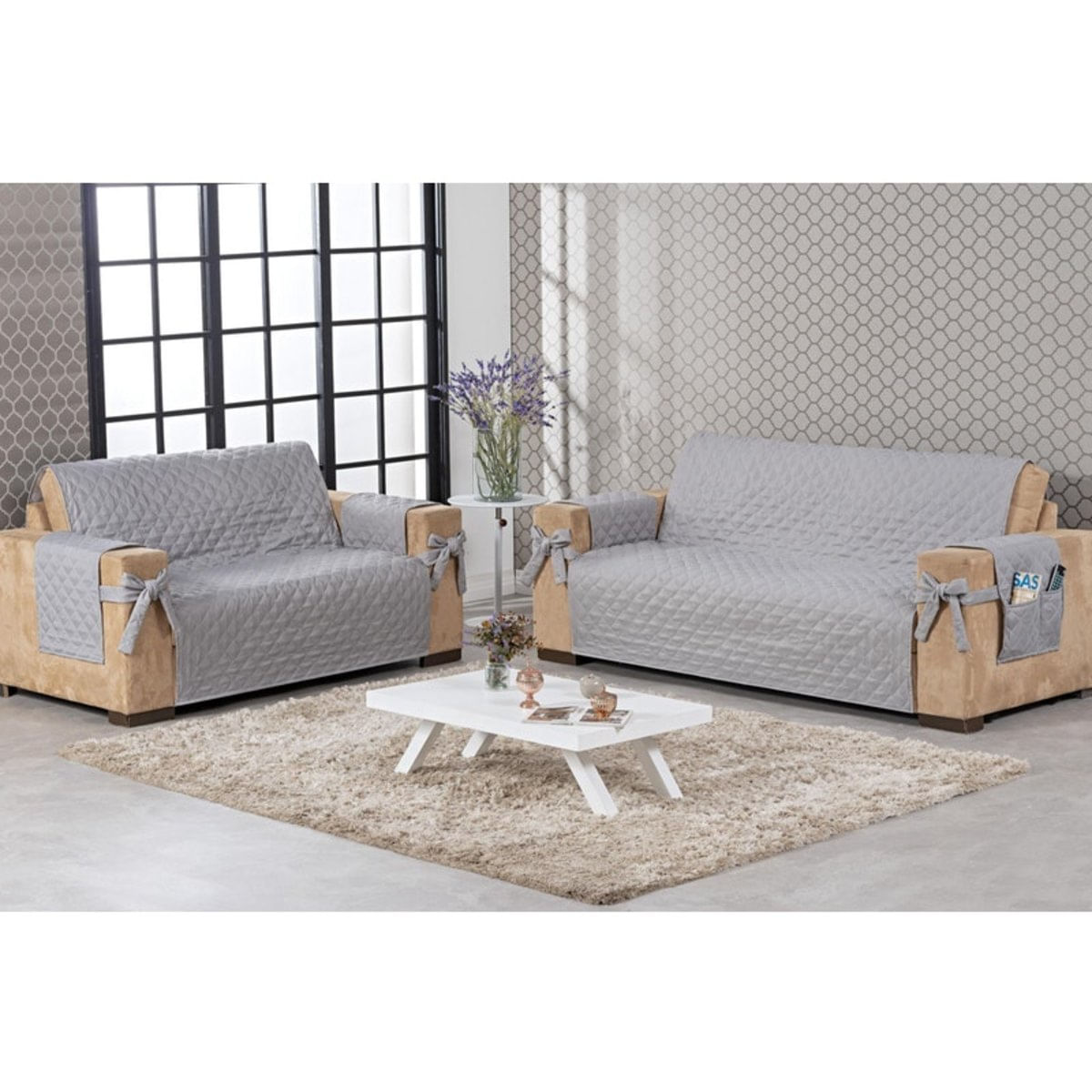 Protetor de sofá 2 e 3 lugares face única com laço..O kit capa para sofá é feito para diversos tipos de sofá, é ideal para você decorar a sua sala para que você receba sua visita em um ambiente mais bonito e agradável, além de proteger o seu sofá de manchas, sujeiras e outro tipo de dano que possa ser causado com o tempo...Contém:..01 protetor de sofá para 2 lugares 1,90m x 1,00m..01 protetor de sofá para 3 lugares 1,90m x 1,50m..Medida dos 4 protetores para braço: 0,75cm x 0,48cm..Composição:..Tecido: 100% poliéster.Enchimento: 100% poliéster.Forro: tnt gramatura 20.Cor: Cinza.Detalhe do laço: todo matelado..Fabricação própria