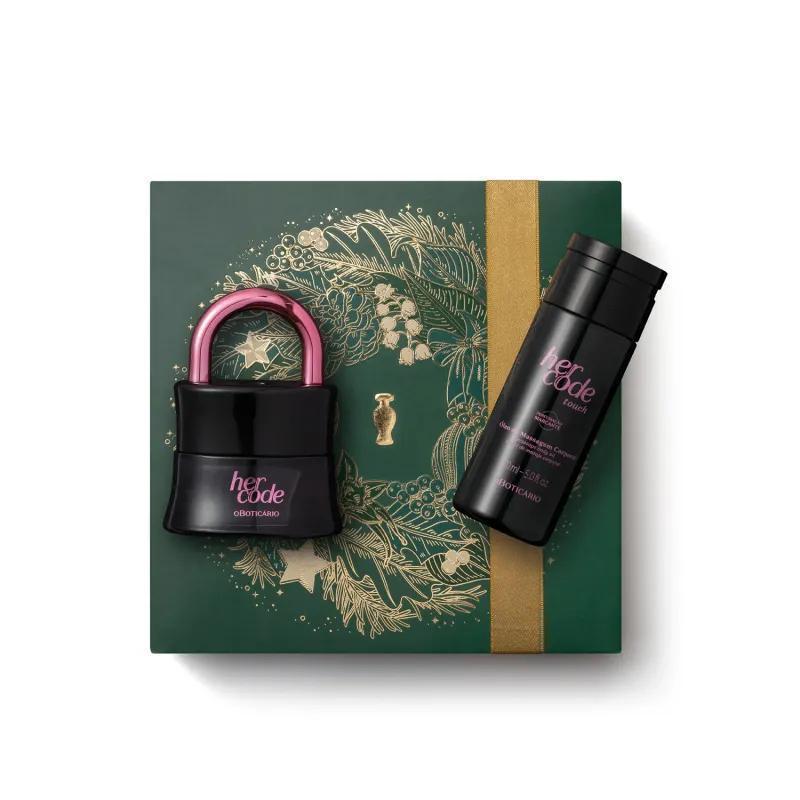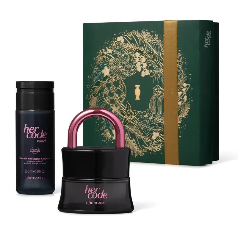 O Kit Presente Natal Her Code Touch vem com o óleo de massagem corporal e a Eau de Parfum , para a sua pessoa especial se envolver na fragrância marcante e sofisticada de Her Code Touch. Ambos os itens vêm embalados em uma caixa de presente especial.