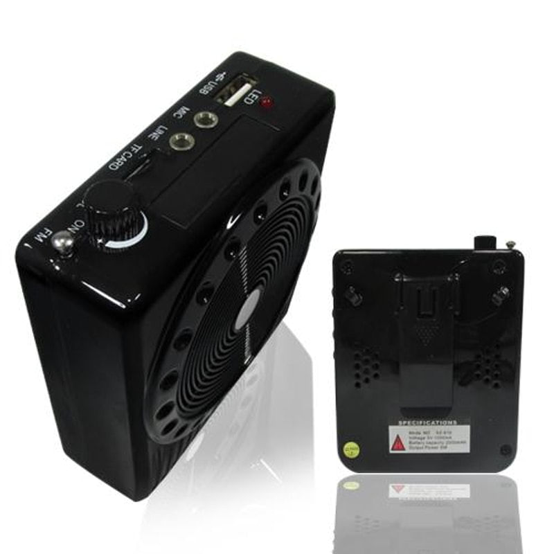 Kit Professor Megaphone C/ Microfone (Preto)..Para você que é professor, palestrante, vendedor ambulante, feirante que precisa chamar a atenção do público ou exerce funções que exigem muito o uso vocal. O amplificador portátil de Voz com Microfone MK-502 é perfeito para resolver seu problema! Ideal para dar aulas, palestras, vendas e fazer tour em eventos, empresas ou qualquer atividade que reúnam grupo de pessoas e que tenha a necessidade de falar alto sem forçar sua voz. Pode também ser usado para ouvir rádio FM e ainda amplificar o som do seu celular, computador, notebook ou Tablet, já que ele possui entrada auxiliar (P2) e um cabo conector já incluso!..ESPECIFICAÇÃO:.Portátil.Leve.Ideal para:.- Dar aulas.- Palestras.- Fazer tour em eventos e empresas.- Vendedores que precisam chamar a atenção do público.Rádio FM digital com busca automática de alta sensibilidade.Microfone com tiara em aço escovado fosco.Amplificador integrado de alto ganho.Alto falante de 3,5 polegadas.Led indicador de carga/ operação.Função de equalização automática para pendrive e cartões de memória.Controle de volume com potenciômetro logaritmo para melhor acuidade..Duração de até 15 horas com a carga da bateria completa!.Entrada USB.Entrada para cartão de memória MicroSD ou micro pendrive com até 16 gb (Pode ouvir suas músicas direto do cartão de memória pelo Amplificador/ Não acompanha cartão Sd ).Entrada Auxiliar (P2).Amplifique o som do seu celular, computador, notebook ou Tablet!.Função Avanço rápido /Rebobinar e operação conveniente.Bateria interna de íon de Lítio de 7,4 V ( Alta Capacidade ).Recarregável via cabo USB.Entrada para fonte ou carregador externo 5v.- Potência de saída: RMS 20w.- Frequência: 85dB.- Resposta de frequência: 100Hz ? 1300Hz.- Temperatura de trabalho: -10 ºC -45 ºC.- Sensibilidade do mirofone: -53 Dbv / Pa.- Uso de tensão: DC 5V.Dimensões:.Comprimento: 10,5cm.Largura: 9cm.Altura: 3,5cM.Peso: 240g..ITENS INCLUSOS:..01 - Amplificador de voz.01 - Cabo para recarregar a bateria com saída USB.01- Microfone