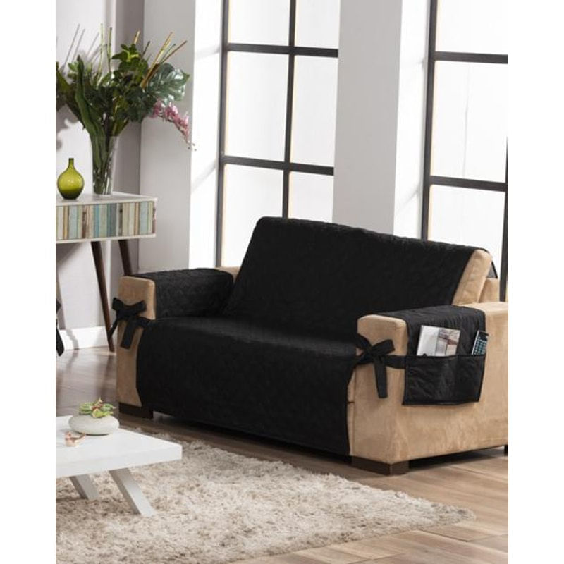 Kit protetor de sofá 2 lugares preto com porta objetos lateral e laço . Protetor de sofá 2 lugares face única com laço. .A capa para sofá é feito para diversos tipos de sofá, é ideal para você decorar a sua sala para que você receba sua visita em um ambiente mais bonito e agradável, além de proteger o seu sofá de manchas, sujeiras e outro tipo de dano que possa ser causado com o tempo.. .Contém:. .01 protetor de sofá para 2 lugares 1,90m x 1,10m.. .Medida dos 2 protetores para braço: 0,75cm x 0,48cm. .Composição:. .Tecido: 100% poliéster.Enchimento: 100% poliéster.Forro: tnt gramatura 20. .Detalhe do laço: todo matelado. .Fabricação própria marca:Beatriz Enxovais