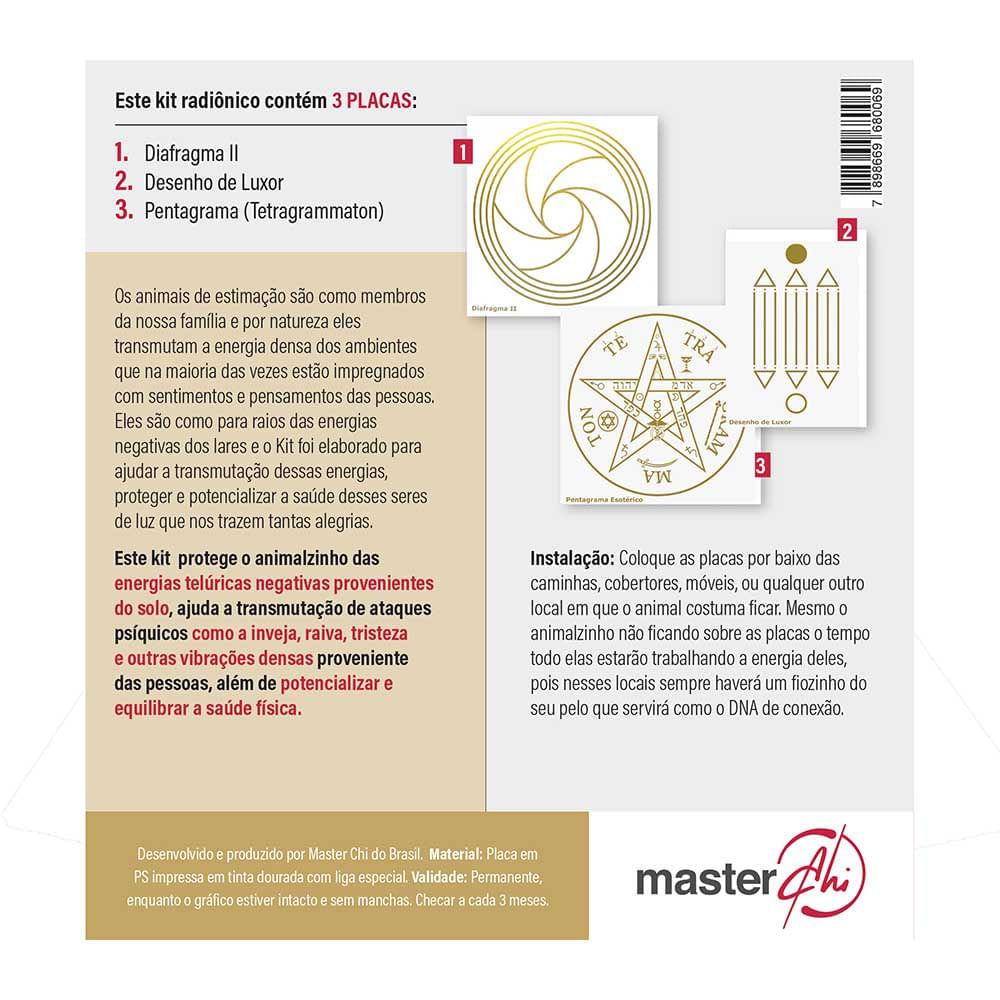 Kit Radiônico Proteção e Saúde do Pet Descrição: Cuidado e carinho nunca é demais para todos os membros da família! Os animais de estimação são como membros da nossa família e por natureza eles transmutam a energia densa dos ambientes que na maioria das vezes estão impregnados com sentimentos e pensamentos das pessoas. Eles são como para raios das energias negativas dos lares e o Kit foi elaborado para ajudar a transmutação dessas energias, proteger e potencializar a saúde desses seres de luz que nos trazem tantas alegrias. Este kit protege o animalzinho das energias telúricas negativas provenientes do solo, ajuda a transmutação de ataques psíquicos como a inveja, raiva, tristeza e outras vibrações densas proveniente das pessoas, além de potencializar e equilibrar a saúde física. O Kit radiônico Pet contém 3 PLACAS: 1- Diafragma II 2- Desenho de Luxor 3- Pentagrama (Tetragrammaton) Especificações: Instalação: Coloque as placas por baixo das caminhas, cobertores, móveis, ou qualquer outro local em que o animal costuma ficar. Mesmo o animalzinho não ficando sobre as placas o tempo todo elas estarão trabalhando a energia deles, pois nesses locais sempre haverá um fiozinho do seu pelo que servirá como o DNA de conexão. Cuidados: Checar as placas de três em três meses para verificar se não há manchas. Caso haja, é sinal da proteção feita pela placa. Substitua o item manchado imediatamente. Dados Técnicos: Dimensões: Diafragma II 14,0 x 14,0 (cm). Desenho de Luxor 14,0 x 10,0 (cm). Pentagrama (Tetragrammaton) 14,0 x 14,0 (cm). Material: Placa em PS impressa em tinta dourada com liga especial. Duração: Validade permanente enquanto estiver intacto o gráfico e sem manchas.