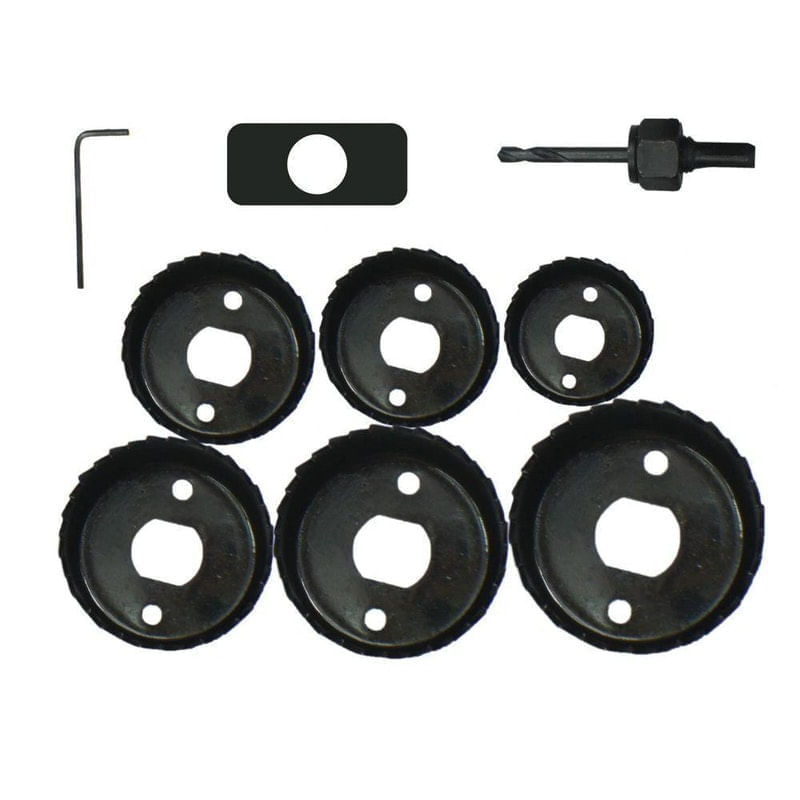 Kit serra copo..Código: 2903.Contem no Kit: 9 Peças..6 copos nos tamanhos:.50mm (2).60mm (2 3/8).65mm (2 1/2).73mm (2 7/8).76mm (3).86mm (3 3/8).Mandril 6mm (1/4).Chave alien 6mm(1/4).Trava de encaixe Entidade:Jogo de serra copo unidades (por pacote):1 cor:Preto marca:Fertak