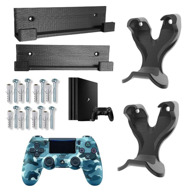 1 suporte de parede controle playstation ps4 joystick e acessórios na parede..1 suporte de parede para o videogame ps4 pro. .Esse anúncio não contém o controle..Esse anúncio não contém o video game..Não vendemos o video game..Não vendemos o controle.. .Suporta o controle do ps4..Suporta o video game ps4 pro.. .Compatibilidade:.-controle ps4.-ps4 pro.. .Itens do kit:.-2 suportes de parede de controle ps4..-1 suporte de parede para o video game ps4 pro..-parafusos e buchas para fixação.. .Material : pla (polímero de alta resistência)..Cor preta. Entidade:Suporte para console marca:Playstation 4 marca:Propria