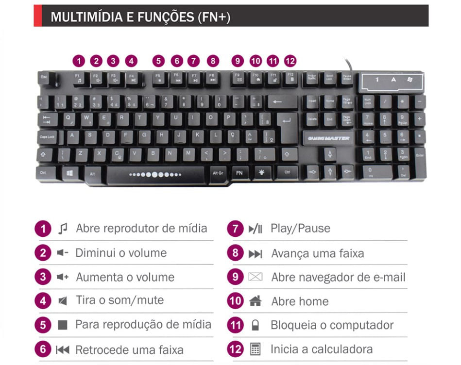 Teclado Gamer Com Funções Multimídiapadrão Abnt 2caracteres Translúcidos Por Laserfunção Anti-ghosting De 19 Dígitos: Q+a+z+w+s+x+e+d+c+b+espaço + + + + + Tab +alt L/v+ctrl L/f+shift Vcor: Preto03 Efeitos De Led E Opção Para Oscilação Automáticacores Dos Leds: Vermelho, Verde, Azul, Amarelo, Ciano E Violetacontrole De Intensidade Da Iluminação Dos Ledsindicador De Ativação Em Led Verde Para Num Lock, Caps Lock E Lockhighcap Keys