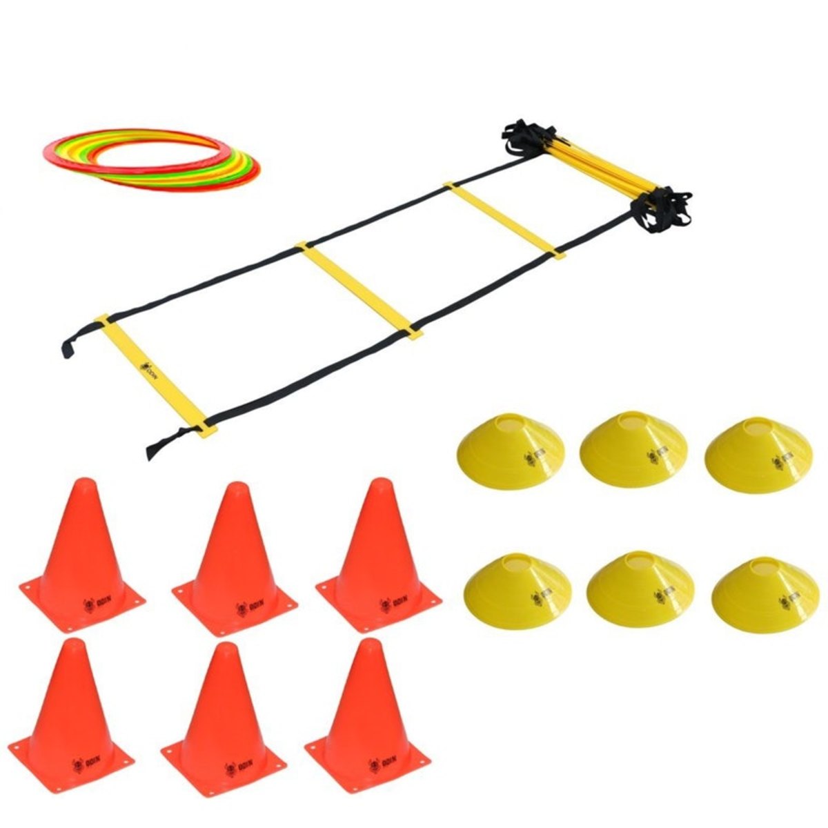 KIT contém uma escada de agilidade PVC 4m 8 degraus + 8 Argolas de Agilidade + 6 cones 15cm Laranjas + 6 cones Half tipo Chapeu Chinês Amarelos..Inclui bolsa para a Escada de Agilidade..Escada de agilidade:..Boa fixação no chão, degraus de PVC,.Leve,.Fácil de montar e armazenar,.Escada estendida mede 4 metros,.Distância entre os degraus ajustável,.Possui 8 degraus,.A escada de agilidade é utilizada em treinamentos fitness e de diversas modalidades esportivas com o objetivo de desenvolver, além de agilidade, velocidade, senso de direção, coordenação e equilíbrio...Ela é leve, fácil de montar e fácil de armazenar. Possui duas tiras de nylon medindo 4 metros e oito degraus de PVC medindo 50 centímetros...Especificações da Escada:.Cor: Amarela,.Comprimento: 4 metros,.Largura dos degraus: 50 cm,..Especificações da Argola:.Cor: Sortida,.Material: Polipropileno,.Diâmetro: 40cm,..Kit Contém:.1(uma) Escada de agilidade Amarela com 4m e 8 degraus de PVC,.1 (uma) Bolsa para a Escada de Agilidade,.8 (oito) Argolas de Agilidade de cores sortidas,.6 (seis) Cones de Agilidade 15cm Laranjas,.6 (seis) Cones tipo Chapéu Chinês Amarelos.
