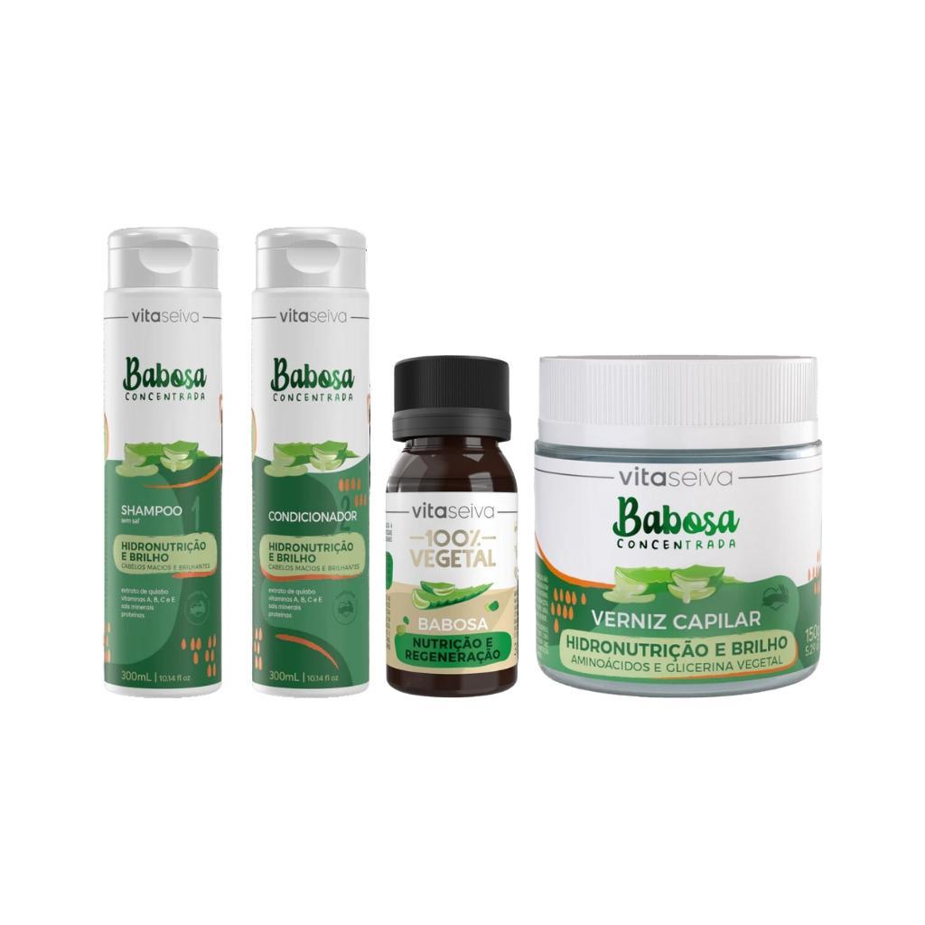Esse Kit Contém: 1 Shampoo Vita Seiva Babosa 300ml, 1 Condicionador Vita Seiva Babosa 300ml, Verniz Capilar Vita Seiva Babosa 150g E 1 Oleo Capilar Vegetal Vita Seiva Babosa 30ml.