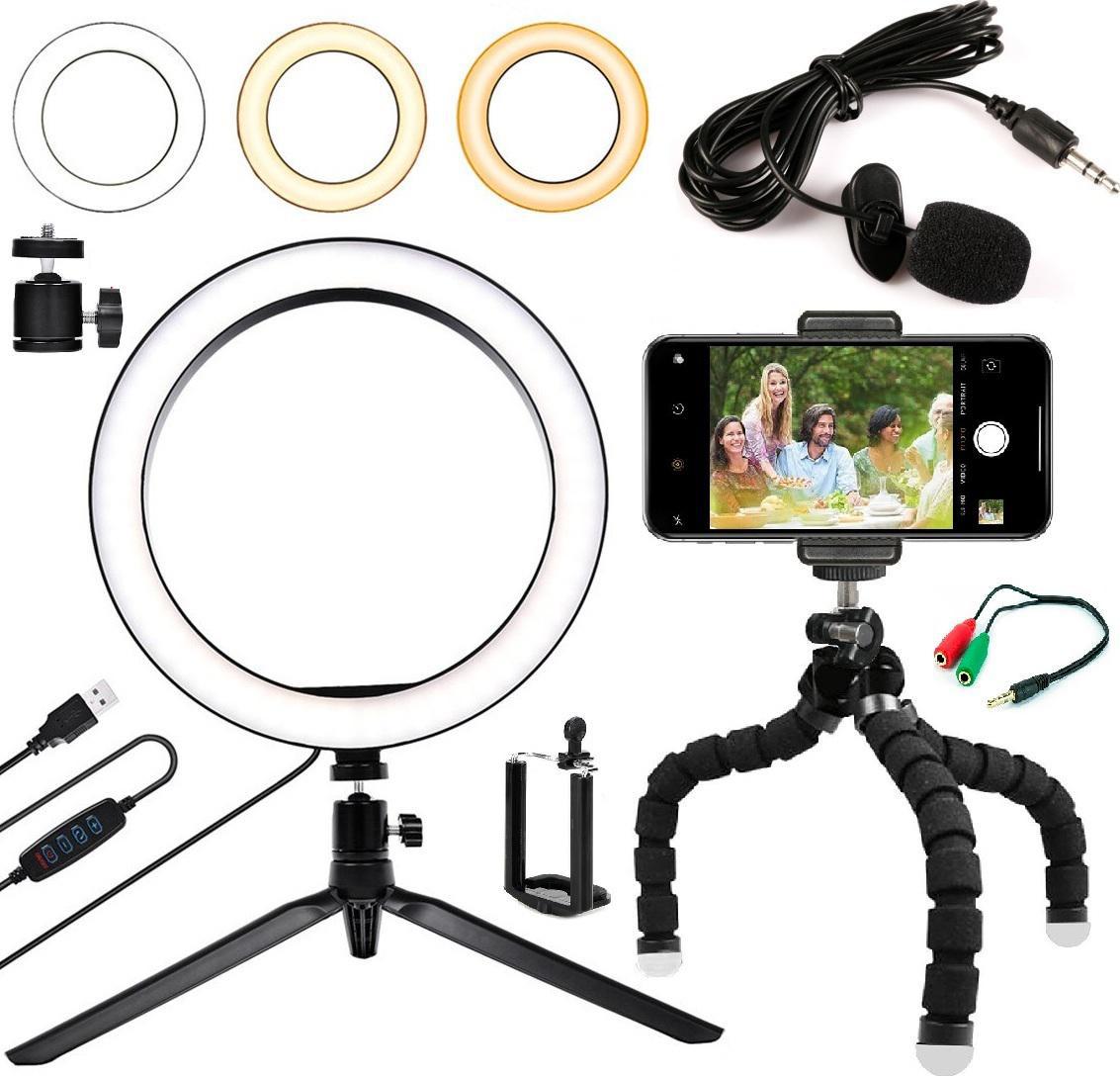 Kit Youtuber Microfone Lapela Celular Universal Tripé Luz Led Iluminador Ring Light Anel Gravação Vídeo
