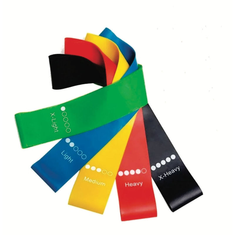 Kit com 5 faixas mini band..O extensor elástico faixas mini band mbfit são ideais para exercícios de reabilitação, condicionamento físico e fortalecimento muscular...Ideal para alongamentos, exercícios de fortalecimento e resistência muscular para os membros superiores e inferiores. Pode ser utilizado por qualquer pessoa, independente de sua estatura e medidas. Melhore seu rendimento e promova uma evolução mais rápida de força e resistência nos seus treinos...05 faixas mini band:.01 faixa extra light para exercícios extra leves, 0,35 mm de espessura, força de 4,5 kg..01 faixa light para exercícios leves, 0,5 mm de espessura, força de 6,8 kg..01 faixa medium para exercícios intermediários, 0,7 mm de espessura, força de 11,33 kg..01 faixa heavy para exercícios pesados, 0,9 mm de espessura, força de 15,9 kg..01 faixa extra-heavy para exercícios avançados, 1,1 mm de espessura, força de 20,4 kg..01 bolsa portátil para colocar as faixas elásticas