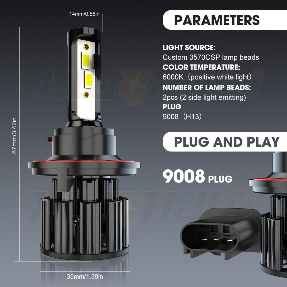 - Vida Útil De Até 60.000 Horas - 9008 Lâmpadas Vêm Com Dissipador De Calor De Alumínio Prensado A Frio E Ventilador De Resfriamento De 12.000 Rmp, Fornecendo Um Sistema De Resfriamento Altamente Eficiente E Confiável, Prolongando A Vida Útil Da Lâmpada.