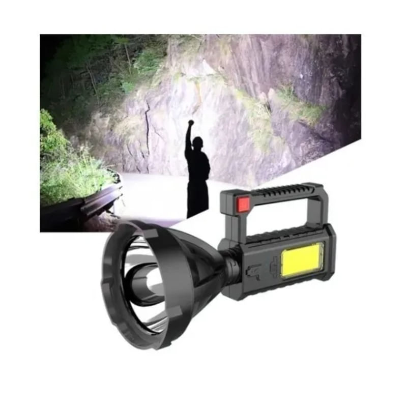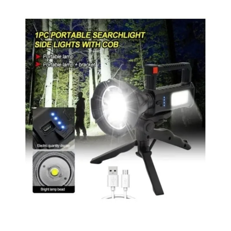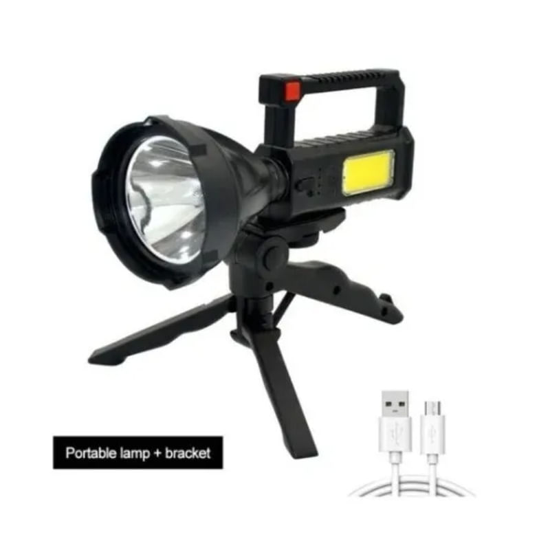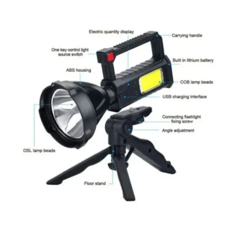 . Especificações:\ Nmaterial: Plástico Abs\ Ndisplay De Alimentação Led: 25%, 50%, 75% E 100%\ Nalto Brilho: Lâmpada Led + Cob\ Ntamanho Do Produto: 19,5x11x9 Cm. Características: Resistente Ao Desgaste E Antiderrapante. - Carregamento Rápido Usb - Bateria De Lítio Embutida De Alta Capacidade - Ligeiramente À Prova D'água (não Pode Ser Jogado Todo O Item Na Água) - Ideal Para Acampar Ou Usar Em Casa. - Tem Uma Luz Lateral Conveniente - A Luz Tem 3 Variações, Incluindo Uma Variação De Luz Estroboscópica O Que Está Na Caixa 1 X Lâmpada Manual 1 X Usb 1 Cabo De Carregamento X Tripé
