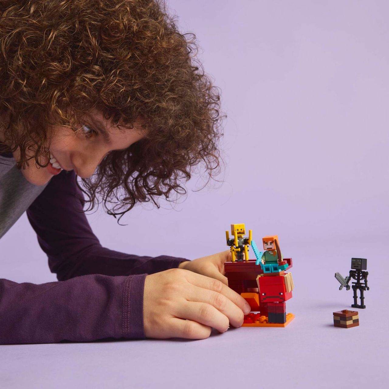 Ação Da Fortaleza Lego® Minecraft® Nether – Os Jogadores Precisarão De Suas Habilidades Para Coletar Destroços Antigos, Escapar De Uma Queda De Lava, Lutar Contra Multidões E Montar Em Uma Figura Do Minecraft Para Chegar Em Segurança