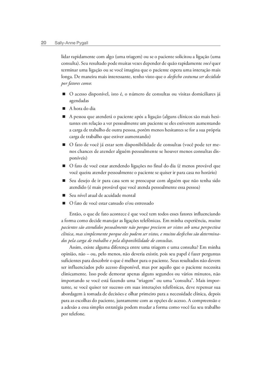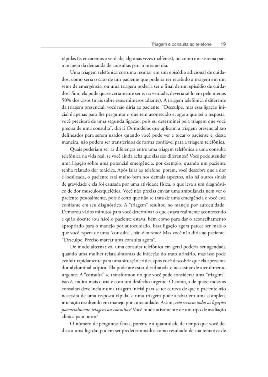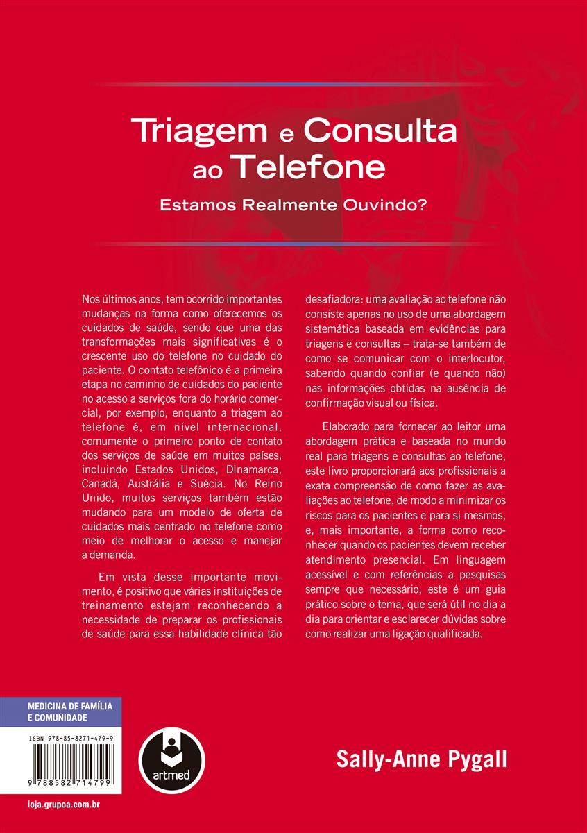 Elaborado para fornecer ao leitor uma abordagem prática e baseada no mundo real para triagens e consultas ao telefone, este livro proporcionará aos profissionais a exata compreensão de como fazer as avaliações ao telefone, de modo a minimizar os riscos para os pacientes e para si mesmos, e, mais importante, a forma como reconhecer quando os pacientes devem receber atendimento presencial. Em linguagem acessível e com referências a pesquisas sempre que necessário, este é um guia prático sobre o tema, que será útil no dia a dia para orientar e esclarecer dúvidas sobre como realizar uma ligação qualificada. Obra chancelada pela Sociedade Brasileira de Medicina de Família e Comunidade.