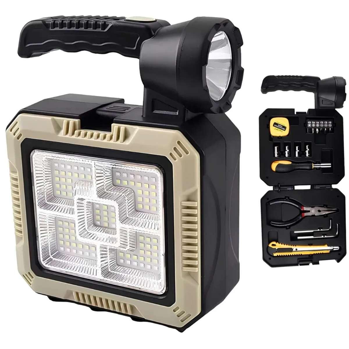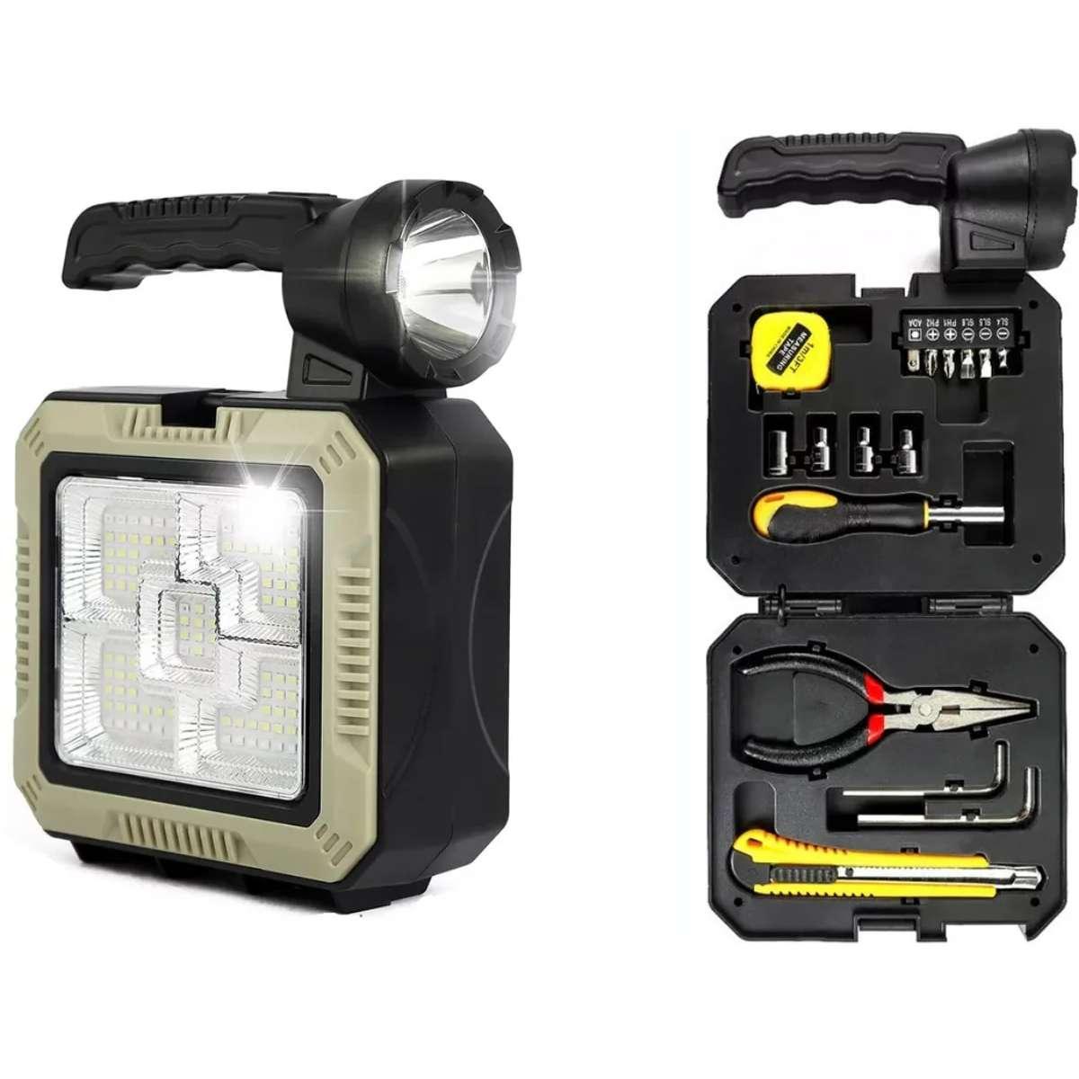 A Lanterna Luminária Com Kit De Ferramentas Integrado É A Solução Completa Para Quem Busca Iluminação Potente E Praticidade Em Um Só Produto Ideal Para Uso Em Casa, Acampamentos, Emergências Ou No Carro, Ela Combina Uma Lanterna De Alto Brilho Com Uma Maleta Completa De Ferramentas Essenciais.