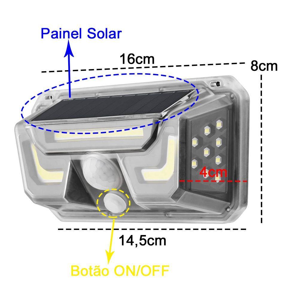 Luminaria Solar Sensor Movimento Automatico Spot Led Branco Frio Bionico Lampada Parede Casa Jardim Quintal Segurança Aproximidade Rualuminaria Com Detector De Movimento, Acende Automatico. Com Autonomia De Até 18 Horas, Quando Recarregada Por Completo.ideal Para Manter A Segurança Ao Seu Redor Com Economia E Sustentabilidade.a Luminária É Alimentada Por Energia Solar, Ou Seja, Os Sensores Fotovoltaicos Acoplados À Peça Convertem A Luz Do Sol Em Energia Elétrica, Carregando As Baterias Internas, Mantendo-a Acesa Após O Sensor De Movimento Captar Aproximação.economia, Praticidade E Segurança Em Um Mesmo Produto.como Funciona:aperte O Botão On/off E A Luminária Irá Ligar. Após 20 Segundos Sem Movimento Ao Entorno A Luminária Apagará.assim Que Detectar Alguma Presença, Ela Acenderá Automaticamente.ela É Capaz De Identificar Presença Com Até 3 Metros De Distancia.características:cor: Pretomaterial: Polipropilenofonte De Energia: Solartempo De Carga: 18 Horasautonomia De Funcionamento: Varia De Acordo Com O Uso.resistente À Chuva E Respingos (ip66)luz: Branco Frio48 Leds (34 Leds Smd E 26 Cob Leds)painel Solar: 5.5v / 0.9wbateria: 5.5v / 160madetecta Presença De Até: 3 Metros De Distânciasensor De Movimento Ângulo: 60botão: On/offdimensões Aproximadas:altura: 8cmlargura: 16cmconteúdo Da Embalagem:1x Luminária Solar Com Sensor De Movimento1x Kit Instalação (parafusos E 2 Pedaços Quadrado De Fita Dupla Face 4x4)3 Meses De Garantia Contra Defeitos De Fabricação**260g Mod: Jba-bion