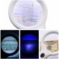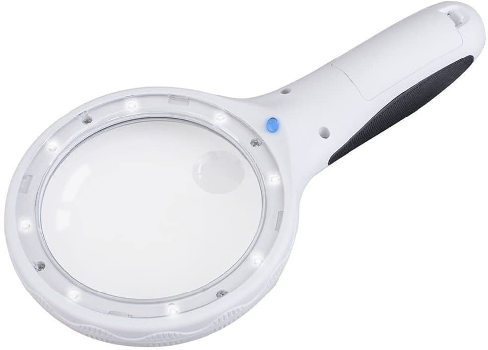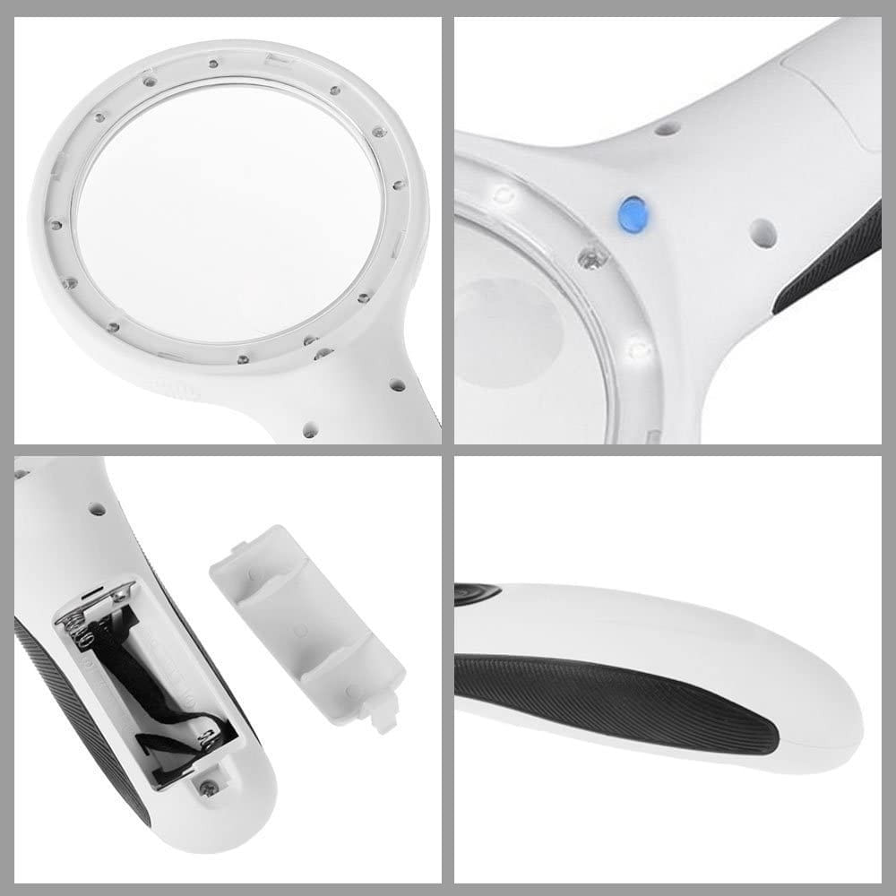 * Lente de aumento leve e de alta qualidade com poder de ampliação , . em dois níveis: Lente primária Extra Grande 85 mm de diâmetro com , . 3x e Lente auxiliar 25 mm com 10x. , . * A lente e a moldura óticas são feitas de material acrílico . , . * Design ergonômico confortável. Iluminado com luzes LED ecológicas , . e com baixo consumo de energia , . * 8 luzes brancas ultra brilhantes e 1 luz violeta alimentadas por três , . pilhas AAA (a bateria está incluída). , . * Luz Violeta para detecção de moeda . * Você pode ver objetos claramente em ambientes claros ou escuros , .  ,com essas 8 poderosas luzes LED. . * Design compacto e elegante, leve e portátil. . * Ótimo para leitura sênior, baixa visão, inspeção, artesanato e hobby, , . reparo eletrônico e joias