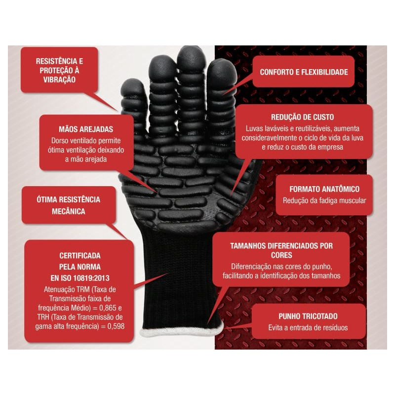 Luva de segurança confeccionada em fibras naturais e sintéticas, revestimento palmar, pontas e face palmar dos dedos em borracha foam (espuma) em formato de gomos. CA: 38257..Indicada para trabalhos com médias e altas agressões. Utilizada nos setores operacionais de Indústrias e Serviços Automotivos, Metal-Mecânica, Aeronáutica, Transportadoras, Construção Civil, Atividades em vibrações constantes reduzindo a exposição ocupacional às Vibrações em Mãos e Braços (VMB) como operação de Martelete Rompedor, Compactador de Solo, Chave de Impacto Pneumática 3/4´ ou 1´, Desincrustador Pneumático e outras atividades com exposição do usuário à vibrações nas palmas das mãos....ESPECIFICAÇÕES.CA: 38257.Tamanhos: M, G, EG..Uso: Reutilizável.Formato: Anatômico.Estrutura: Suporte Têxtil.Modelo da Estrutura: Tricotado.Material Suporte: Fibras naturais e sintéticas.Descontos especiais para pacote com 12 pares ou caixa com 60 pares.Preço de 1 PAR.Punho: Tricotado.Grip: Gomos de borracha foam