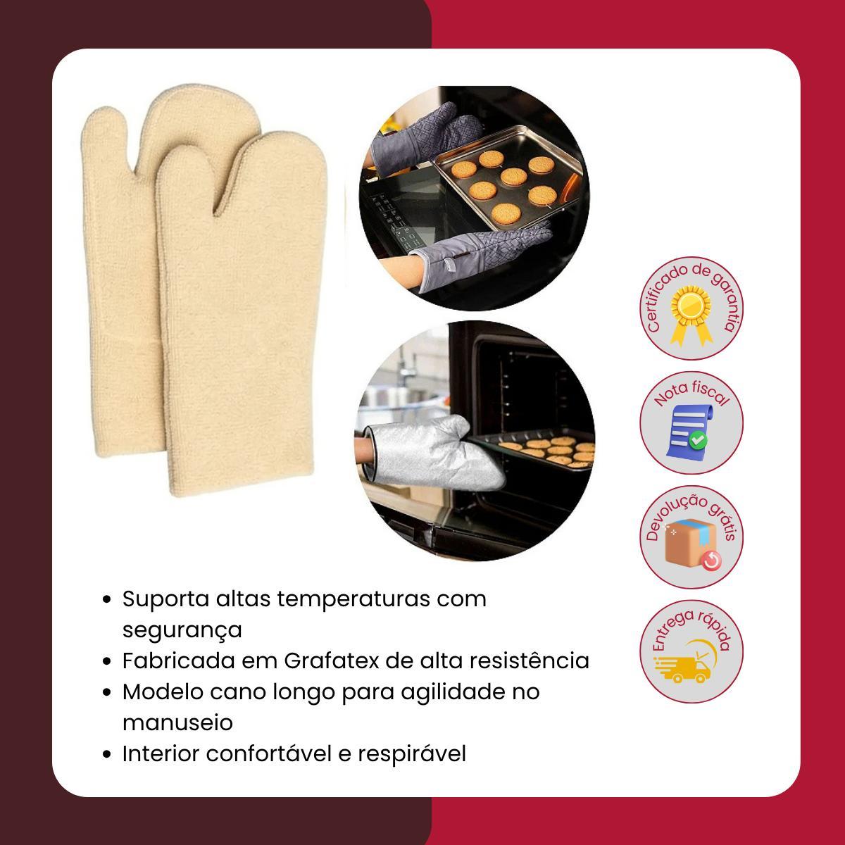 Suporta Altas Temperaturas Com Segurança Fabricada Em Grafatex De Alta Resistência Modelo Cano Longo Para Agilidade No Manuseio Interior Confortável E Respirável Protege Mãos E Punhos Contra Queimaduras Ideal Para Fornos, Churrasqueiras E Confeitarias Material Durável E De Longa Vida Útil Antiderrapante E Firme No Toque Lavável E Fácil De Higienizar Excelente Custo-benefício Para Uso Profissional