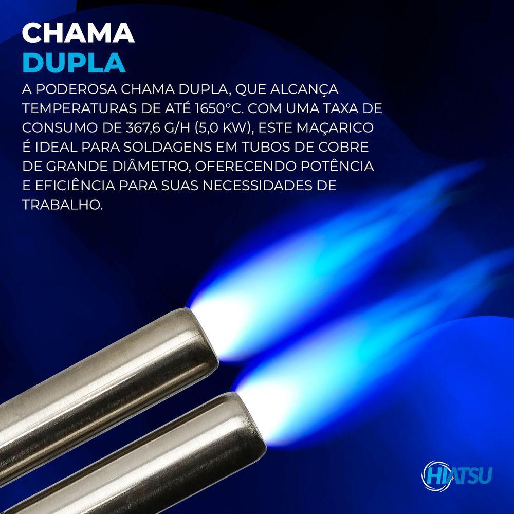 Com Uma Chama Dupla Potente, O Maçarico Alcança Temperaturas Impressionantes De Até 1650°C, Combinando Eficiência E Rapidez Com Uma Taxa De Consumo De 367,6 G/h (5,0 Kw). Essa Característica Torna-o Perfeito Para Aplicações Em Tubos De Cobre De Grande Diâmetro, Onde A Qualidade Da Soldagem É Crítica, Garantindo Resultados Consistentes E De Alta Qualidade.