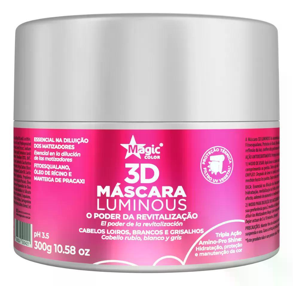 Magic Color - Máscara 3d Luminous 300gfoi Desenvolvido Para Uma Rotina De Cuidado Diário Dos Loiros, Brancos E Grisalhos. Promove Hidratação Intensa, Interage Com As Proteínas Da Fibra Capilar Aumentando A Reflexão Da Luz, Conferindo Alta Performance De Brilho E Revitalização Da Cor. Com Proteção Térmica E Filtro Uv Vegetal.- Revitaliza A Cor,- Hidratação Intensa,- Alta Performance De Brilho.sugestão De Uso:1 - Após Lavar Os Cabelos Com Shampoo 3d Luminous, Aplicar A Máscara Nos Cabelos Levemente Úmidos,2 - Massageie Suavemente Mecha A Mecha Do Comprimento Às Pontas,3 - Deixe Agir Entre 3 E 10 Minutos. Enxágue E Finalize Como Desejar.o Que Você Está Comprando01 - Máscara 3d Luminous Magic Color - 300g.não Testado Em Animais,imagens Meramente Ilustrativas.