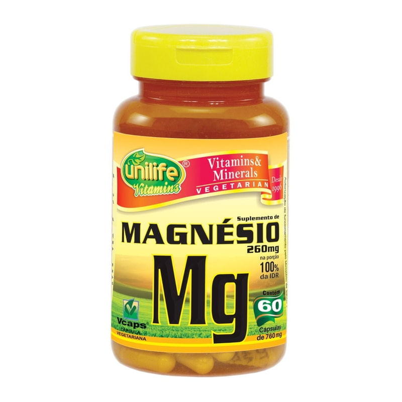 Magnesio Quelato Mg 60 Caps 760mg Unilife Vitamins..Auxilia na ativação de hormônios, enzimas, contração muscular e na função cardíaca....Ingredientes: Magnésio quelato, excipiente q.s.p. 760mg, gelatina vegetal e umectante glicerina..Apresentação: Cápsula de 760 mg..Peso total da cápsula: 760 mg..Classificação da cápsula: Vegetal..Classificação do conteúdo: Vegetal..Prazo de validade: 2 anos..Modo de ingestão: Sugere-se a ingestão de 2 cápsulas ao dia, após a refeição. Ingerir com líquido..Condições de armazenamento: Conserve o produto bem fechado, em temperatura entre 15ºC e 25ºC e umidade relativa do ar entre 35% e 65%..Informações: Gestantes, nutrizes e crianças até 3 (três) anos, somente devem consumir este produto sob orientação de nutricionista ou médico..Consumir este produto conforme recomendação de ingestão diária constante na embalagem. Não consumir mais que 2 cápsulas ao dia