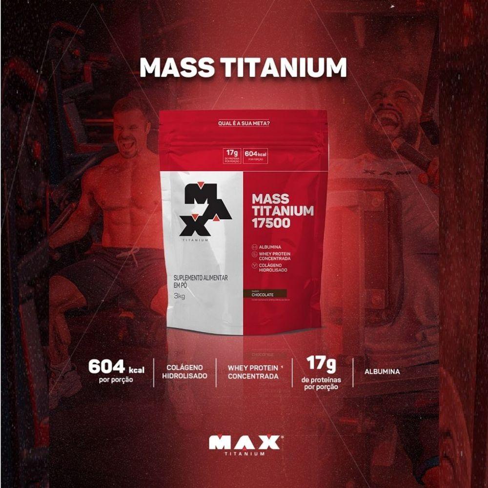 Mass Titanium 17500 (3kg) - Sabor: Vitamina De Frutasmass Titanium - Max Titanium Hipercalóricos São Compostos Por Carboidratos E Proteínas De Alto Valor Biológico, Vitaminas E Minerais. É Indicado Para Quem Tem O Metabolismo Acelerado E Dificuldade De Ganhar Massa Magra. Ajuda No Ganho De Volume De Massa Muscular E Peso, Melhora A Performance, Supre Necessidades De Energia E Auxilia Na Recuperação Pós-treino. Apresentam Composições De Carboidratos E Proteínas De Alto Valor Biológico, Contendo Proteína Concentrada Do Soro Do Leite (wpi), Albumina E Colágeno Hidrolisado, Contribui Para Um Bom Aporte Calórico Diário, Especialmente Para Pessoas Que Tem Dificuldade De Ganhar Peso Corporal, Auxilia No Aumento Do Glicogênio Muscular E Sintese De Glicogênio Também. Mass Titanium Contém Em Sua Fórmula Exclusiva Três Tipos De Proteínas Com Alto Valor Biológico: Whey Protein Concentrada, Colágeno Hidrolisado E Albumina Do Ovo. Os Hipercalóricos São Indicados Para Pessoas Que Têm O Metabolismo Muito Acelerado E Que Querem Ganhar Peso. Benefícios:* Aumento Do Aporte Calórico,* Aumento De Energia,* Recuperação De Glicogênio Muscular, * Aumento Do Peso Corporal.informação Nutricional Mass Titanium (3kg) - Max Titaniumporção De 160g (5 Dosadores Cheios)quantidade Por Porção%vd(*)valor Energético604kcal=2.537kj30carboidratos132g44proteínas17g23gorduras Totais0,9g2gorduras Saturadas0,4g2gorduras Trans0g-fibra Alimentar0g0sódio183mg8cálcio151mg15* % Valores Diários Com Base Em Uma Dieta De 2.000kcal Ou 8400kj. Seus Valores Diários Podem Ser Maiores Ou Menores Dependendo Das Suas Necessidades Energéticas. Obs: Pode Haver Pequenas Variações Na Informação Nutricional, De Acordo Com O Sabor. Informação Nutricional Mass Titanium (3kg) - Max Titanium - Leite Condensadoporção De 160g (5 Dosadores Cheios)quantidade Por Porção%vd(*)valor Energético609kca31carboidratos134g45açúcares Totais17g Açúcares Adicionados1122proteínas17g34gorduras Totais0,5g1sódio294g15cálcio101mg10* % Valores Diários Com Base Em Uma Dieta De 2.000kcal Ou 8400kj. Seus Valores Diários Podem Ser Maiores Ou Menores Dependendo Das Suas Necessidades Energéticas. Obs: Pode Haver Pequenas Variações Na Informação Nutricional, De Acordo Com O Sabor. Informação Nutricional Mass Titanium (3kg) - Max Titanium - Chocolateporção De 160g (5 Dosadores Cheios)quantidade Por Porção%vd(*)valor Energético610kcal31carboidratos133g44açúcares Totais17g Açúcares Adicionados11g22proteínas17g34gorduras Totais0,9g2gorduras Saturadas0,4g2gorduras Trans0g-fibra Alimentar0g0sódio287mg14cálcio98mg10* % Valores Diários Com Base Em Uma Dieta De 2.000kcal Ou 8400kj. Seus Valores Diários Podem Ser Maiores Ou Menores Dependendo Das Suas Necessidades Energéticas. Obs: Pode Haver Pequenas Variações Na Informação Nutricional, De Acordo Com O Sabor.