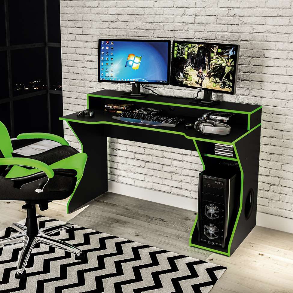 Que tal a Mesa Gamer Fremont?O seu ambiente gamer vai ficar muito mais completo com a presença da Mesa Gamer Fremont! Desenvolvida para amadores e profissionais, ela é a combinação perfeita para quem já utiliza as famosas cadeiras do mesmo estilo, enquanto o tampo espaçoso e os demais compartimentos servem para que as peças do seu computador fiquem bem dispostas e na posição ideal para você fazer as melhores jogadas. De quebra, possui a cor preta com detalhes em verde para realçar a decoração do cômodo e deixá-lo a sua cara ,)