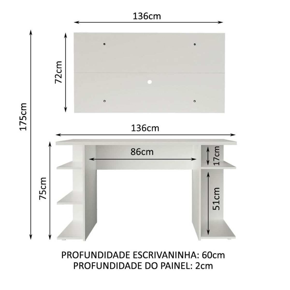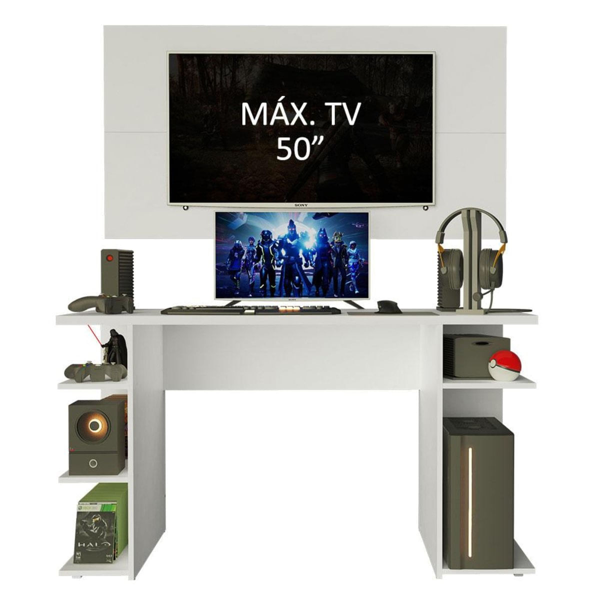 O Conjunto da Mesa Gamer 9409 da Madesa + Painel para TV oferece conforto, otimização de espaço e um design moderno.A mesa comporta perfeitamente monitor, teclado, mouse, controle, caixas de som, fone e o que mais você preferir. Possui também diversas prateleiras, perfeitas para CPU, console, jogos e outros objetos decorativos. Além disso, pode ser utilizada como escrivaninha para trabalho ou estudo.Já o painel suporta TV de até 50 polegadas possui abertura central para passagem dos fios, deixando tudo muito mais organizado. É de fácil instalação, conta com passa fios e capas decorativas para esconder os parafusos de fixação.O acabamento dos móveis é branco, feito em com a Pintura Poliéster de 7 camadas exclusiva da Madesa, um processo ecológico e que oferece maior proteção.Imagens meramente ilustrativas. Não acompanha a decoração e o painel não acompanha suporte para fixação da TV.Itens inclusos:- Uma (1) Mesa Gamer com 75 cm de altura, 136 cm de largura e 60 cm de profundidade- Um (1) Painel com 72 cm de altura, 136 cm de largura e 2 cm de profundidadeCódigo do produto: MDFC02000109Obs.: A Madesa não disponibiliza serviço de montagem. O produto acompanha ferragens e manual com todos os passos para a instalação da mesa.1 O produto é novo ou usado?R.: Todos os produtos da Madesa são novos, enviados da nossa fábrica diretamente para as casas de nossos clientes.2 O produto vem montado? Se não, vocês realizam a montagem?R.: A Madesa não disponibiliza serviço de montagem. Todos os produtos seguem com manual de instalação e as ferragens necessárias. Alguns produtos possuem vídeo explicando o passo a passo da montagem.3 Vocês possuem loja física? Posso retirar meu produto em mãos?R.: Não possuímos loja física, apenas loja virtual. Confira as opções de envio ao colocar o seu CEP.4 Qual é o valor do envio? Posso pagar separadamente?R.: O valor do envio é calculado com base no peso e volume do produto, e no CEP de destino. Você pode calcular o valor e prazo de entrega no simulador.5 A Madesa entrega em todo Brasil? Como é feita a entrega?R.: Sim, entregamos no Brasil inteiro através de transportadoras parceiras.6 O produto acompanha Nota Fiscal?R.: Sim, todos os produtos são entregues com suas respectivas notas fiscais.7 Os produtos possuem garantia?R.: Sim. A Madesa oferece 3 meses de garantia para defeitos de fabricação.