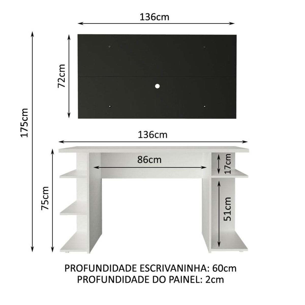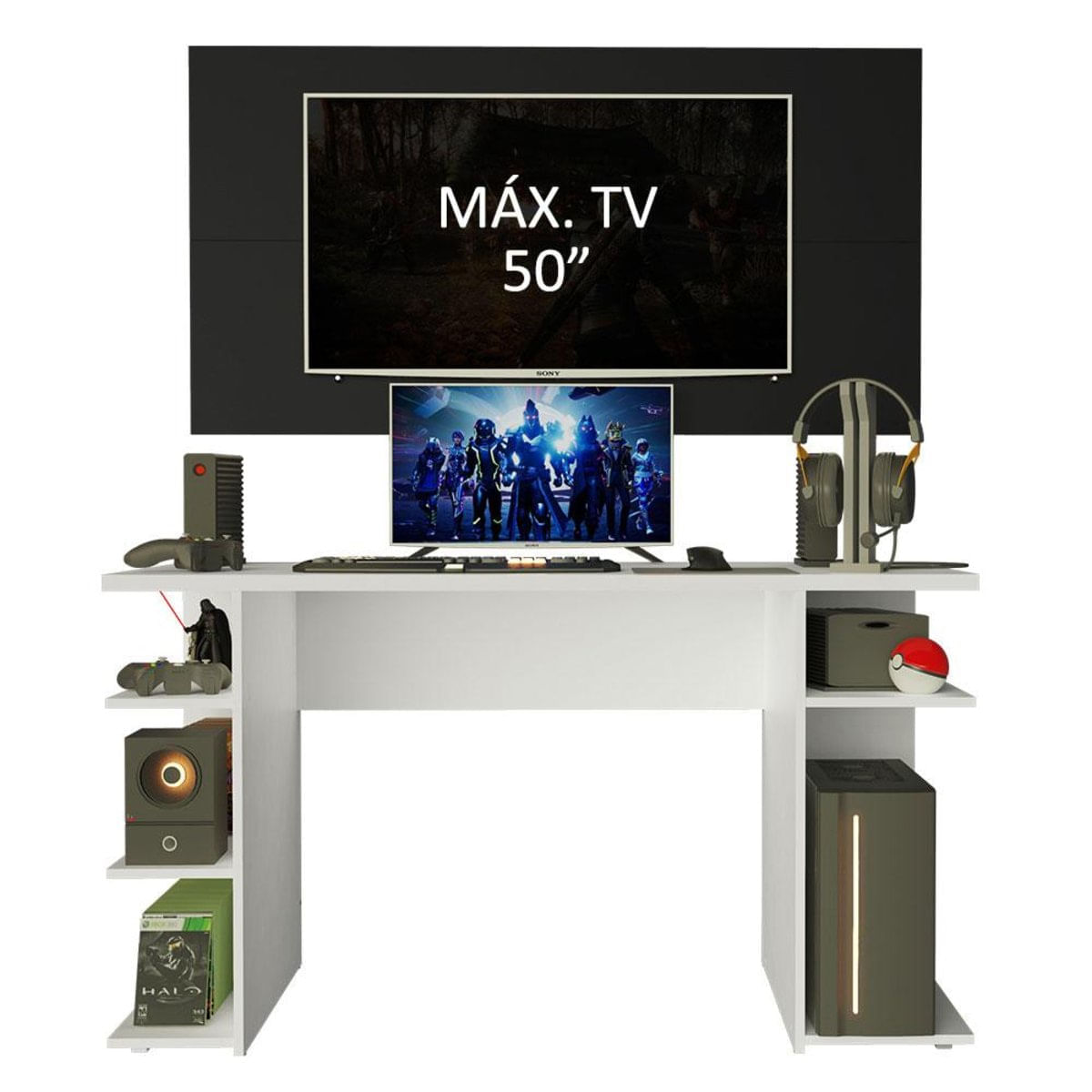 O Conjunto da Mesa Gamer 9409 da Madesa + Painel para TV oferece conforto, otimização de espaço e um design moderno.A mesa comporta perfeitamente monitor, teclado, mouse, controle, caixas de som, fone e o que mais você preferir. Possui também diversas prateleiras, perfeitas para CPU, console, jogos e outros objetos decorativos. Além disso, pode ser utilizada como escrivaninha para trabalho ou estudo.Já o painel suporta TV de até 50 polegadas possui abertura central para passagem dos fios, deixando tudo muito mais organizado. É de fácil instalação, conta com passa fios e capas decorativas para esconder os parafusos de fixação.O acabamento da mesa é branco e o do painel é preto. É feito com a Pintura Poliéster de 7 camadas exclusiva da Madesa, um método ecológico e que oferece maior proteção.Imagens meramente ilustrativas. Não acompanha a decoração e o painel não acompanha suporte para fixação da TV.Itens inclusos:- Uma (1) Mesa Gamer com 75 cm de altura, 136 cm de largura e 60 cm de profundidade- Um (1) Painel com 72 cm de altura, 136 cm de largura e 2 cm de profundidadeCódigo do produto: MDFC02000173Obs.: A Madesa não disponibiliza serviço de montagem. O produto acompanha ferragens e manual com todos os passos para a instalação da mesa.1 O produto é novo ou usado?R.: Todos os produtos da Madesa são novos, enviados da nossa fábrica diretamente para as casas de nossos clientes.2 O produto vem montado? Se não, vocês realizam a montagem?R.: A Madesa não disponibiliza serviço de montagem. Todos os produtos seguem com manual de instalação e as ferragens necessárias. Alguns produtos possuem vídeo explicando o passo a passo da montagem.3 Vocês possuem loja física? Posso retirar meu produto em mãos?R.: Não possuímos loja física, apenas loja virtual. Confira as opções de envio ao colocar o seu CEP.4 Qual é o valor do envio? Posso pagar separadamente?R.: O valor do envio é calculado com base no peso e volume do produto, e no CEP de destino. Você pode calcular o valor e prazo de entrega no simulador.5 A Madesa entrega em todo Brasil? Como é feita a entrega?R.: Sim, entregamos no Brasil inteiro através de transportadoras parceiras.6 O produto acompanha Nota Fiscal?R.: Sim, todos os produtos são entregues com suas respectivas notas fiscais.7 Os produtos possuem garantia?R.: Sim. A Madesa oferece 3 meses de garantia para defeitos de fabricação.