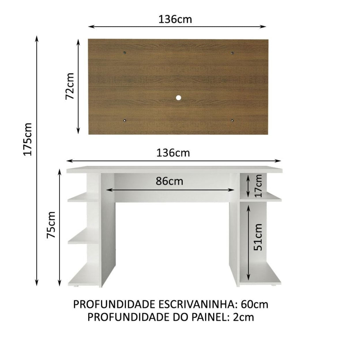 O Conjunto da Mesa Gamer 9409 da Madesa + Painel para TV oferece conforto, otimização de espaço e um design moderno.A mesa comporta perfeitamente monitor, teclado, mouse, controle, caixas de som, fone e o que mais você preferir. Possui também diversas prateleiras, perfeitas para CPU, console, jogos e outros objetos decorativos. Além disso, pode ser utilizada como escrivaninha para trabalho ou estudo.Já o painel suporta TV de até 50 polegadas possui abertura central para passagem dos fios, deixando tudo muito mais organizado. É de fácil instalação, conta com passa fios e capas decorativas para esconder os parafusos de fixação.O acabamento da mesa é branco e o do painel é no padrão amadeirado Rustic. O processo é feito em Pintura Poliéster ecológica com 7 camadas de proteção.Imagens meramente ilustrativas. Não acompanha a decoração e o painel não acompanha suporte para fixação da TV.Itens inclusos:- Uma (1) Mesa Gamer com 75 cm de altura, 136 cm de largura e 60 cm de profundidade- Um (1) Painel com 72 cm de altura, 136 cm de largura e 2 cm de profundidadeCódigo do produto: MDFC0200019BObs.: A Madesa não disponibiliza serviço de montagem. O produto acompanha ferragens e manual com todos os passos para a instalação da mesa.1 O produto é novo ou usado?R.: Todos os produtos da Madesa são novos, enviados da nossa fábrica diretamente para as casas de nossos clientes.2 O produto vem montado? Se não, vocês realizam a montagem?R.: A Madesa não disponibiliza serviço de montagem. Todos os produtos seguem com manual de instalação e as ferragens necessárias. Alguns produtos possuem vídeo explicando o passo a passo da montagem.3 Vocês possuem loja física? Posso retirar meu produto em mãos?R.: Não possuímos loja física, apenas loja virtual. Confira as opções de envio ao colocar o seu CEP.4 Qual é o valor do envio? Posso pagar separadamente?R.: O valor do envio é calculado com base no peso e volume do produto, e no CEP de destino. Você pode calcular o valor e prazo de entrega no simulador.5 A Madesa entrega em todo Brasil? Como é feita a entrega?R.: Sim, entregamos no Brasil inteiro através de transportadoras parceiras.6 O produto acompanha Nota Fiscal?R.: Sim, todos os produtos são entregues com suas respectivas notas fiscais.7 Os produtos possuem garantia?R.: Sim. A Madesa oferece 3 meses de garantia para defeitos de fabricação.