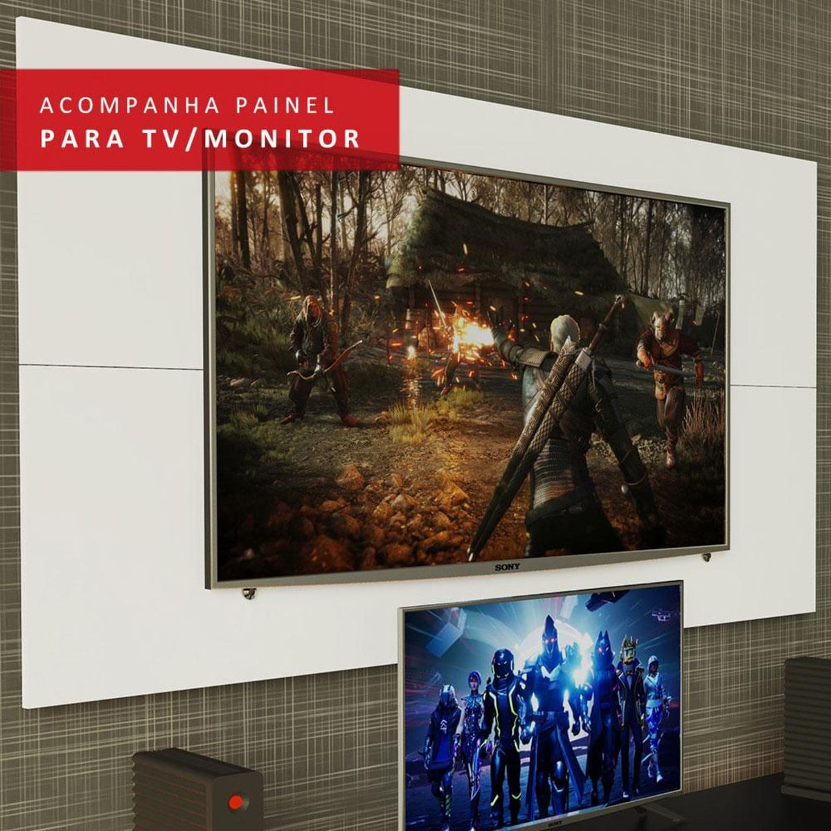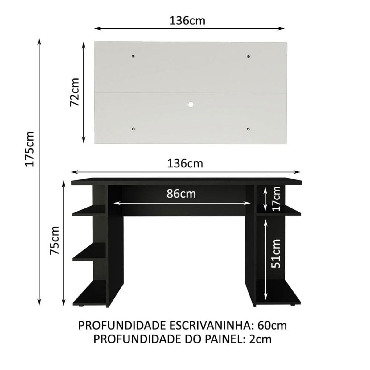 O Conjunto da Mesa Gamer 9409 da Madesa + Painel para TV oferece conforto, otimização de espaço e um design moderno.A mesa comporta perfeitamente monitor, teclado, mouse, controle, caixas de som, fone e o que mais você preferir. Possui também diversas prateleiras, perfeitas para CPU, console, jogos e outros objetos decorativos. Além disso, pode ser utilizada como escrivaninha para trabalho ou estudo.Já o painel suporta TV de até 50 polegadas possui abertura central para passagem dos fios, deixando tudo muito mais organizado. É de fácil instalação, conta com passa fios e capas decorativas para esconder os parafusos de fixação.O acabamento da mesa é preto e o do painel é branco. É feito com a Pintura Poliéster de 7 camadas exclusiva da Madesa, um método ecológico e que oferece maior proteção.Imagens meramente ilustrativas. Não acompanha a decoração e o painel não acompanha suporte para fixação da TV.Itens inclusos:- Uma (1) Mesa Gamer com 75 cm de altura, 136 cm de largura e 60 cm de profundidade- Um (1) Painel com 72 cm de altura, 136 cm de largura e 2 cm de profundidadeCódigo do produto: MDFC02000177Obs.: A Madesa não disponibiliza serviço de montagem. O produto acompanha ferragens e manual com todos os passos para a instalação da mesa.1 O produto é novo ou usado?R.: Todos os produtos da Madesa são novos, enviados da nossa fábrica diretamente para as casas de nossos clientes.2 O produto vem montado? Se não, vocês realizam a montagem?R.: A Madesa não disponibiliza serviço de montagem. Todos os produtos seguem com manual de instalação e as ferragens necessárias. Alguns produtos possuem vídeo explicando o passo a passo da montagem.3 Vocês possuem loja física? Posso retirar meu produto em mãos?R.: Não possuímos loja física, apenas loja virtual. Confira as opções de envio ao colocar o seu CEP.4 Qual é o valor do envio? Posso pagar separadamente?R.: O valor do envio é calculado com base no peso e volume do produto, e no CEP de destino. Você pode calcular o valor e prazo de entrega no simulador.5 A Madesa entrega em todo Brasil? Como é feita a entrega?R.: Sim, entregamos no Brasil inteiro através de transportadoras parceiras.6 O produto acompanha Nota Fiscal?R.: Sim, todos os produtos são entregues com suas respectivas notas fiscais.7 Os produtos possuem garantia?R.: Sim. A Madesa oferece 3 meses de garantia para defeitos de fabricação.