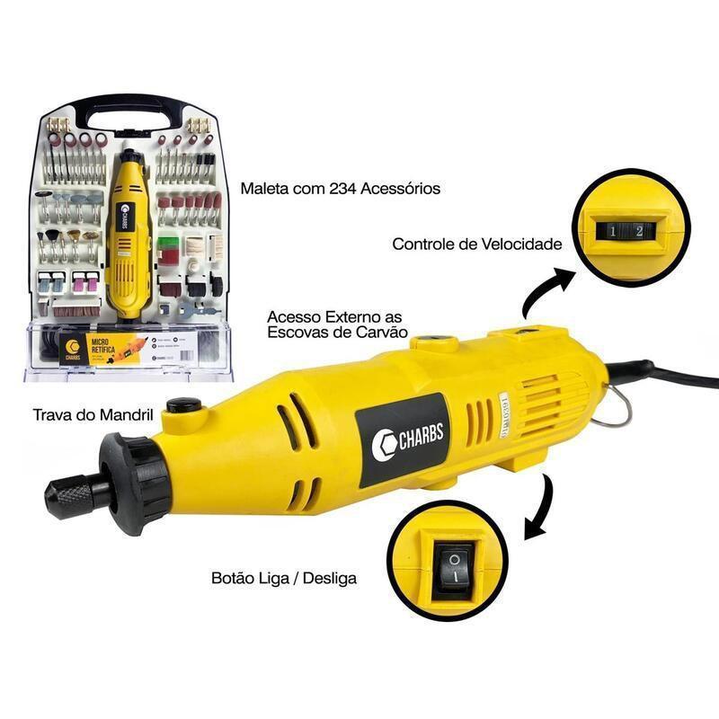 Mini Retífica Charbs É A Ferramenta Ideal Para Trabalhos De Desbaste, Remoção, Limpeza, Polimento, Gravação, Lixamento E Furação De Diferentes Tipos De Materiais E Superfícies. Tenha Em Mãos Um Kit Que Reúne Tudo O Que Você Precisa Em Uma Exclusiva Maleta Portátil Para Você Levar Onde For
