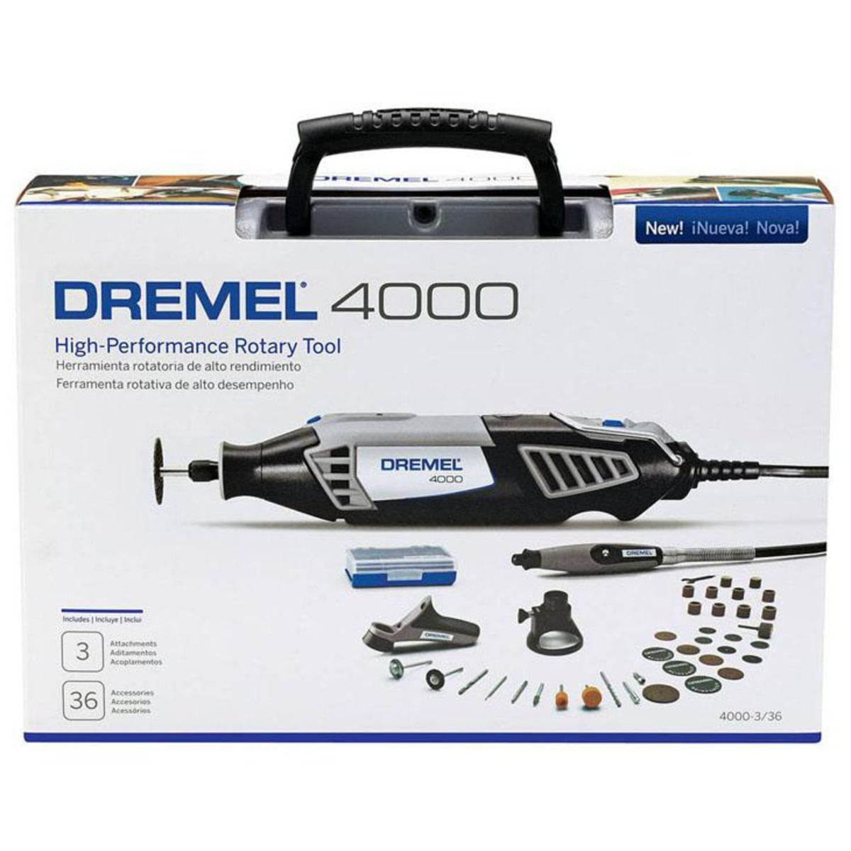 Micro Retífica Dremel 4000, 36 acessórios A Micro Retífica Dremel 4000 e seus 36 acessórios, conta com oito aplicações para que você consiga desempenhar um bom trabalho. Uma ferramenta profissional ideal para trabalhos em Metal, madeira, plástico, vidro, cerâmicas, Dy whal, porcelanato, possui corpo emborrachado facilitando o trabalho, dando mais conforto a quem a opera. Aplicação: Vidro, fibra de vidro, madeira, metal, plástico, cerâmica, azulejo, drywall, alvenaria, papelão e EVA. Uso: Cortar, lixar, limpar, polir, esculpir, gravar, esmerilhar, afiar, fresar e furar PVC. Especificações técnicas: Potência: 175 Watts, Rotação: 5.000-35.000 rpm, Acoplamentos: 3, Material: Corpo emborrachado ergonômico Velocidade Variável, Botão trava e destrava para troca rápida de acessórios, Interruptor liga/desliga independente do botão de controle de velocidade, Constante eletrônico de tração, Motor de alta performance, Escovas de carvão substituíveis, Colar de agarre para trabalhos de precisão. Itens Inclusos 01 maleta plástica 01 eixo flexível 01 empunhadeira auxiliar 01 guia de corte multiuso 01 mini estojo de acessórios 01 manual do usuário 01 chave. 1 tubo de lixa 407 04 tubos de lixa 408 04 tubos de lixa 432 02 tubos de lixa 445 02 discos de lixa 411 02 discos de lixa 412 02 discos de lixa 413 01 broca 3,2 mm 150 01 haste adaptadora 402 01 pinça de 3/32 481 01 escariador 109 01 escariador 191 04 discos de corte 420 03 disco de corte com fibra de vidro 426 01 broca multiuso 561 01 ponta abrasiva de óxido de alumínio 541 01 ponta paralela 8193 01 ponta cônica 84922 01 ponta paralela 932 01 escova de cerdas 403 01 escova de aço carbono 428 Alimentação Voltagem: 220 V Dimensões Tamanho do produto (AxLxP): 26 x 39 x 9,9 cm Peso: 8,10 Kg Garantia: 24 meses