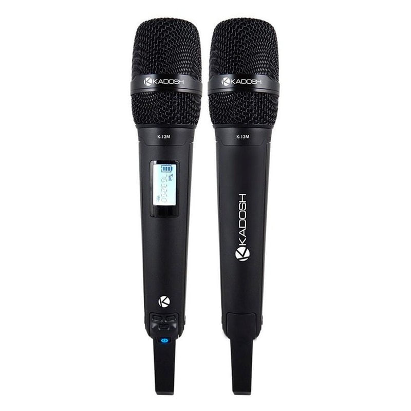 Microfone Sem Fio Kadosh Kdsw-1201M..Microfone único sem fio UHF destinado ao uso em médios e grandes eventos para locução e canto. Capacidade de operação de até 8 sistemas do mesmo modelo desde que o usuário atenda as regras de uso do produto – Não colocar as bases em cima da outra, não cruzar as antenas de outras bases, dar uma distância mínima necessária de 7 cm de cada base, fazer coordenação de frequências – aconselha-se 6Mhz.. .BASE/RX/RECEIVER: Possui 2 antenas Omnidirecional de 1/2 comprimento de onda com conexão BNC, display com informações básicas e necessárias ao usuário (Canal, Frequência, Nível de AF e RF e Antena usada (A/B).. .HANDHELD/TX/BASTÃO: Possui cápsula exclusiva KADOSH K12m, display iluminado na com informações necessárias (frequência, nível de carga das pilhas AA), alimentação com 2 pilhas tipo AA (recomenda-se o uso de Alcalinas). Alerta em forma de pisca e indicação de nível baixo de bateria (low bat).. .Handheld (bastão). .- Globo e corpo em alumínio com pintura especial black piano,.- Cápsula exclusiva Kadosh K12M – Dinâmico Cardióide,.- Botão On/Off – Não possui a função MUTE,.- Botão de navegação para seleção de frequência manual,.- Range de Frequência: 628.0mhz – 647.750mhz,.- Resposta de frequência: 63Hz – 18.000hz,.- Sincronização rápida através de IR,.- Display com informações: Frequência e Nível da carga das pilhas AA,.- Duração de carga com pilha AA: 8h de uso contínuo (Pilhas Alcalinas).