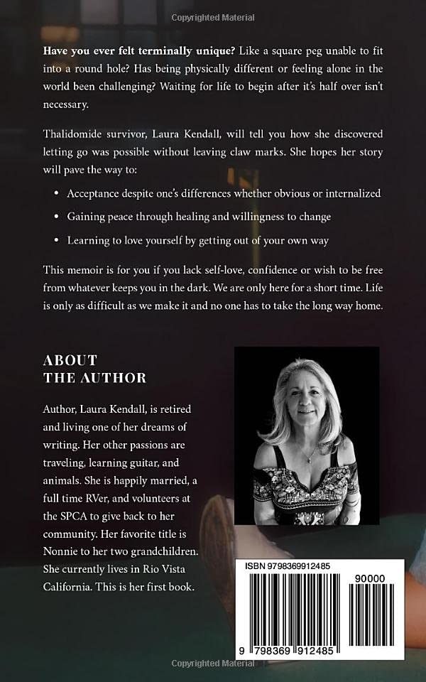 Descrição Do Produtovocê Já Se Sentiu Terminalmente Único? Como Um Pino Quadrado Incapaz De Caber Em Um Buraco Redondo? Ser Fisicamente Diferente Ou Sentir-se Sozinho No Mundo Tem Sido Um Desafio? Esperar Que A Vida Comece Depois Que Ela Terminar Pela Metade Não É Necessário.a Sobrevivente Da Talidomida, Laura Kendall, Contará Como Descobriu Que Deixar Ir Era Possível Sem Deixar Marcas De Garra. Ela Espera Que Sua História Abra O Caminho Para: Aceitação Apesar Das Diferenças, Sejam Óbvias Ou Internalizadas Ganhar Paz Através Da Cura E Da Vontade De Mudar Aprender A Amar A Si Mesmo, Saindo Do Seu Próprio Caminho.este Livro De Memórias É Para Você Se Você Não Tem Amor Próprio, Confiança Ou Deseja Se Libertar De Tudo O Que O Mantém No Escuro. Estamos Aqui Apenas Por Um Curto Período De Tempo. A Vida É Tão Difícil Quanto Nós A Fazemos E Ninguém Tem Que Tomar O Longo Caminho De Casa.revisaramei!★★★★um Livro De Memórias Triunfante Celebrando A Determinação De Ter Sucesso, Independentemente Da Aparência.há Mais Na Narrativa Humanista De Kendall Do Que Metal Frio E Plástico, Mais Para Ela Do Que A Definição Clínica De Sua Condição (focomelia Do Braço Esquerdo). Neste Livro De Memórias, Há Um Verdadeiro Senso De Calor E Inclusão, Com Uma Abordagem Da Escrita Que É Aberta, Honesta E Sincera Por Natureza. É Realmente Uma Montanha-russa De Emoções, Transportando O Leitor Em Uma Jornada Que Absorve Todos Os Elementos Da Vida De Kendall. Você Sai Apreciando Os Desafios Que Kendall Superou, Com A Pitada De Modéstia Que Reconhece Que Há Coisas Que Poderiam Ter Sido Feitas De Forma Diferente (um Tema Particularmente Presente Em Suas Referências Ao Vício Em Drogas E Seu Papel Como Mãe).alice Bennettdescoberta De Reedsysobre O Autorlaura Kendall É Uma Autora Nova E Futu
