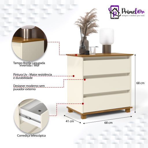 Mini Cômoda Com 3 Gavetas E Pés Em Madeira Ej A Mini Cômoda Ej É Um Móvel Versátil E Funcional, Possui Acabamento Uv E Alto Relevo, 03 Gavetas Sem Puxadores Externos Para Armazenar Seus Objetos, Pés Em Madeira Maciça E Corrediças Telescópicas. Um Móvel Produzido Com Material De Qualidade, Com Design Inovador E Estrutura Robusta Para Quem Busca Elegância E Funcionalidade Em Um Único Produto.   Medidas Do Produto Montado: *altura 0.68 *comprimento 0.68 *largura 0.41     Caracteristicas: *fabricado Em Mdp *03 Gavetas Sem Puxadores Externos *pintura Uv  *pés Em Madeira Maciça *tampo Ergonômico *corrediças Telescópicas       Observações Importantes *produto Não Deve Ficar Exposto Diretamente Ao Sol, Calor E Umidades Excessivas. *recomendamos Que Para Limpeza Utilize Somente Pano Seco Ou Levemente Umedecido Com Água E Seguido De Pano Seco, Não Utilizar Produtos Químicos Ou Abrasivos. *imagens Meramente Ilustrativas, Produto Não Acompanha Objetos De Decorações E Eletrônicos. *ao Receber, Verifique A Embalagem. Se Detectar Alguma Parte Danificada Ou Com Violações Na Mesma, Recuse O Recebimento E Nos Contate. *não Nos Responsabilizamos No Ato Da Entrega, Por Subir Escadas/elevadores Etc... *não Nos Responsabilizamos Pela Montagem, E Por Problemas Causados Pela Montagem Realizada Por Você Ou Montador Contratado. *enfatizamos A Recomendação Aos Nossos Clientes De Contratar Um Montador Profissional. *eventualmente, Se Faltar Qualquer Peça Ou Acessório Do Produto, Nos Contate Imediatamente Para Solução Do Ocorrido. *garantia Do Fabricante: 03 Meses