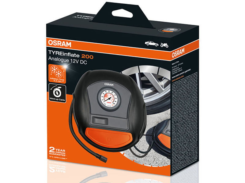 Compressor De Pneus Rápido Com Cabo De Enrolar O Compressor Analógico De Pneu Osram Tyreinflate 200 Enche Um Pneu De 13" Desde Vazio Em Até 4,5 Minutos. Tem Um Grande Botão Liga/desliga Para Facilitar O Uso. O Seu Design Estável Mantém O Compressor Imóvel Durante O Uso. Alimentado Por Uma Tomada De 12 V No Carro, O Longo Cabo De Alimentação De 3 M Do Tyreinflate 200 Facilita O Acesso A Todos Os Pneus Ao Redor Dos Veículos. Mostra Leituras De Pressão Em Kpa, Bar E Psi. Inclui Compartimento De Armazenamento Para Os Pipos Das Válvulas Do Pneu Quando Em Uso. É Fornecido Com Um Conjunto De Três Adaptadores Para Uso Com Pneus De Bicicleta, Pneus De Motociclos, Bolas E Outros Insufláveis. Tempo De Carga (h) N/a Tempo De Enchimento Do Pneu 4.5 Min Comprimento Da Mangueira De Ar 50 Cm Comprimento Do Cabo De Alimentação 3.0 M Dimensão Do Ecrã 50 Mm Unidades De Medição Psi, Kpa, Bar Pressão Máxima 5.5 Bar Precisão (bar) ±0.1 Bar Taxa De Fluxo (l/min) Tbc Dados Elétricos: Tensão De Funcionamento 12 V Fonte De Alimentação 12 V Fused Plug Tensão Nominal 11,1 V Potência Nominal 120,00 W Dados Elétricos Tensão De Funcionamento 12 V Fonte De Alimentação 12 V Fused Plug Tensão Nominal 11,1 V Potência Nominal 120,00 W