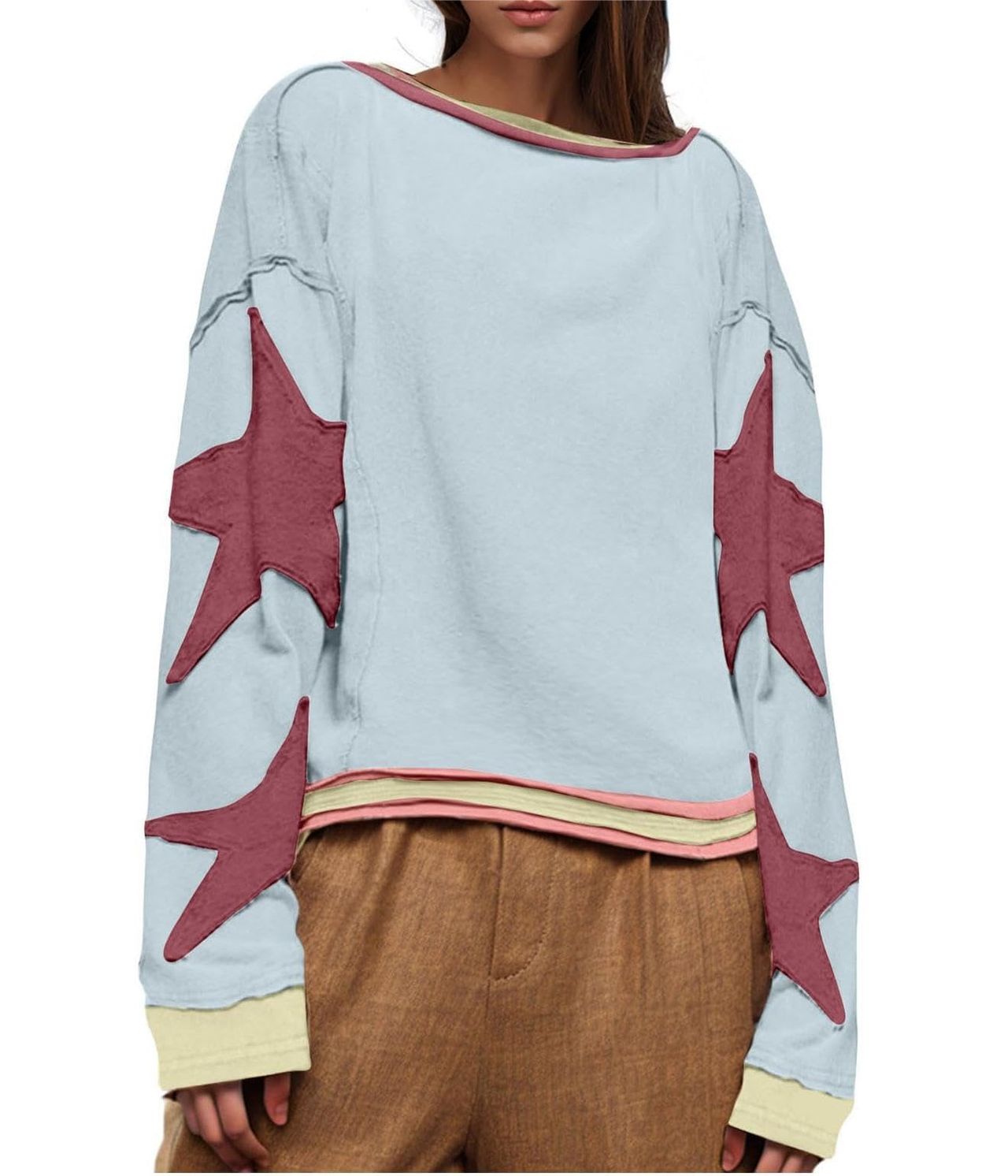 - 【design Elegante】o Moletom Feminino De Patchwork De Outono De 2024 Apresenta Gola Redonda, Manga Comprida, Ombro Caído, Ajuste Solto, Estilo Urbano Moderno, Emblemas De Estrelas Coloridas Tornam Este Moletom Feminino Atraente E Elegante. Este Moletom Grande É Perfeito Para A Mulher Que Quer Se Manter Aquecida E Charmosa O Tempo Todo. Sua Melhor Escolha!