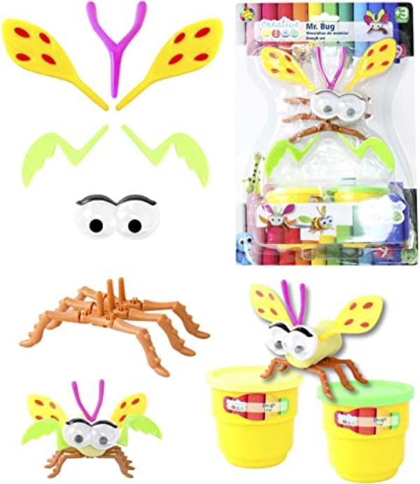 PRODUTO: Mr. Bug - Massinha de Modelar 9pçs As massinhas de modelar da Cretive Kids – Batiki foram desenvolvidas especialmente para desenvolver o raciocínio lógico, estimular a criatividade e deixar a imaginação rolar solta! Conta com grande variedade de cores, dando mais vida nas criações, em tons vibrantes, neons, pastéis e com glitter, além de ser muito macia e fácil de manusear. Você ainda pode criar cores novas fazendo diversas combinações com as cores das massinhas. Com a coleção de massinhas Mr. Bug, a sua imaginação não tem fim! CONTÉM 1 antena, 1 par de olhos, 1 base de pernas, 2 asas, 2 garras e 2 potes de massinha de 52g. Dimensões aproximadas do produto Tamanho Peso 28x19x6,5cm 250g