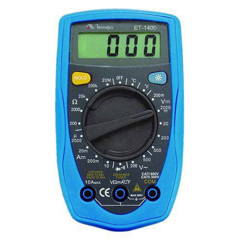 Multímetro digital profissional et1400 original minipa..¿ instrumento digital portátil, que se acomoda na palma da mão, de acordo com a categoria ii 300v de segurança, congelamento da leitura, mudança de faixa manual, holster protetor e lcd de 3 1/2 dígitos, com iluminação de fundo...¿ realiza medidas de tensão dc e ac, corrente dc, resistência e temperatura, e testes de diodo e continuidade...¿ display: 3 1/2 dígitos, 2000 contagens e iluminação de fundo..¿ velocidade de medida: atualização de 2~3 vezes/seg..¿ indicação de polaridade: automática, negativa indicada ¿ ¿..¿ indicação de sobrefaixa: ¿1¿ é mostrado..¿ indicação de bateria fraca: indicação ¿símbolo de bateria¿ será mostrada..¿ mudança de faixa: manual..¿ data hold..¿ temperatura de operação: 0°c a 40°c (32°f a 104°f)..¿ temperatura de armazenamento: 10°c a 50°c (14°f a 122°f)..¿ umidade relativa: 75% à 0°c~30°c, 50% à 31°c~40°c..¿ altitude de operação: 2000m..¿ altitude de armazenamento: 10000m..¿ ambiente para especificação de precisão: 23°c ± 5°c, rh 75%..¿ coeficiente de temperatura: 0,1 x (precisão especificada) / 1°c..¿ alimentação: uma bateria 9v (neda 1604 ou 6f22 ou 006p)..¿ conformidade: iec1010 sobretensão cat i 600v, cat ii 300v e dupla isolação..¿ certificação: ce.¿ dimensões: 130(a) x 73.5(l) x 35(p) mm...especificações:.¿ tensão dc. faixas: 200mv, 2000mv, 20v, 200v, 500 v. precisão: 200mv ~ 200v ± (0.5%+2d), 500v ± (0.8%+2d). resolução: 0.1mv, 1mv, 10mv, 100mv, 1v. impedância de entrada: 10 mohms. proteção de sobrecarga: 200mv: 250v dc / ac, outras: 500v dc / ac..¿ tensão ac. faixas: 200v, 500v. precisão: ± (1.2%+10d). resolução: 100mv, 1v. impedância de entrada: 5 mohms. resposta em frequência: 40hz a 400hz. mostra o valor eficaz de um sinal senoidal (resposta do valor médio). proteção de sobrecarga: 500v dc / ac..¿ corrente dc. faixas: 2000µa, 20ma, 200ma, 10ª. precisão: 2000µa ~ 20ma ± (1.0%+2d), 200ma ± (1.2%+2d), 10a ± (2.0%+5d). resolução: 1µa, 10µa, 100µa, 10ma. proteção de sobrecarga: fusível de ação rápida 0.3a/250v para a entrada µa e ma. a faixa 10a não possui fusível. faixa de 10a medida contínua 10seg e intervalo não menor que 15min...¿ resistência. faixas: 200, 2000, 20k, 200k, 20 mohms. precisão: 200 ohms ± (0.8%+5d), 2000 ~ 200 kohms ± (0.8%+2d), 20 mohms ± (1.0%+5d). resolução: 0,1, 1, 10, 100, 10 kohms. proteção de sobrecarga: 250v dc / ac..¿ temperatura. faixas: 40°c ~ 1000°c, 40°f ~ 1832°f. precisão: 40°c ~ 150°c ± (1.0%+3d), 150°c ~ 1000°c ± (1.5%+15d), 40ºf ~ 302ºf ± (1.0%+4d), 302ºf ~ 1832ºf ± (1.5%+15d). resolução: 1°c, 1°f. tipo de sensor: termopar tipo k. proteção de sobrecarga: 250v dc / ac..¿ diodo. faixa: diodo. descrição: display mostra a queda de tensão direta aproximada de 0.5v ~ 0.8v. resolução: 1mv. proteção de sobrecarga: 250v dc / ac..¿ continuidade. faixa: buzina. descrição: a buzina toca se a resistência for menor que aprox. 70 ohms. resolução: 1 ohms. proteção de sobrecarga: 250v dc / ac..¿ acessórios. manual de instruções. pontas de prova. holster protetor. ponta termopar. bateria