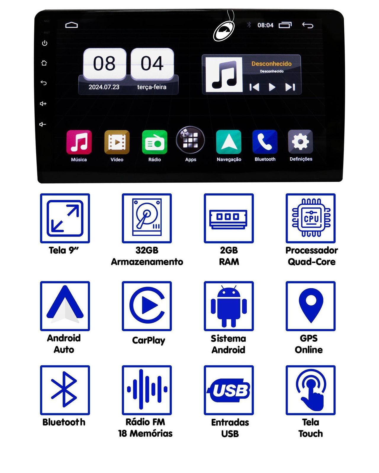 Projetada para aprimorar sua experiência enquanto dirige, a multimídia com tela de 9 oferece uma ampla gama de recursos e entretenimento de alta qualidade. Combinando tecnologia avançada com simplicidade de uso, esta multimídia integra várias funções, como Bluetooth para músicas e ligações telefônicas, espelhamento para que você use os aplicativos do smartphone com mais conforto, 2 entradas USB, compatibilidade com Spotify e muito mais. Além disso, conta com sistema Android para você baixar apps direto da tela do seu multimídia. Torne suas viagens muito mais seguras e divertidas. Você não vai querer sair do carro!