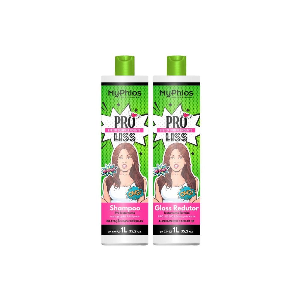 My Phios Kit Progressiva Proliss 2x1L O Kit ProLiss da MyPhios Professional, é um tratamento que transforma cabelos ondulados, crespos e indiciplinados, tornando-os perfeitamente lisos, com volume reduzido, fibra capilar alinhada, livre de frizz e muito brilho. O Gloss para realinhamento térmico tem textura leve, suave e de rápida absorção. Sua formulação conta com Matérias primas cuidadosamente selecionadas, composta por Manteiga de Karité, que age controlando o volume dos fios, hidratando e promovendo um liso intenso desde a primeira aplicação. Tecnologia Proliss 100, ativo seguro e não prejudicial a saúde, age alisando a fibra de dentro para fora, mudando a estrutura dos fios sem uso de formol. Conselho de Aplicação: Lave o cabelo de 2 a 3 vezes com shampoo anti-resíduos e seque o cabelo,Aplique o Gloss respeitando 2 cm da raiz e espalhe até as pontas. (Utilize um pincel ou as próprias mãos com luvas + um pente),deixe agir por 50 minutos em cabelos mais grossos e de 30 a 40 minutos em cabelos mais finos,Enxaguar suavemente, retirando 80% do Produto, Escovar e finalizar com a prancha em mechas finas de 15 a 20 vezes para um melhor resultado. Recomendamos em cabelos loiros ou mais finos usar a prancha a 180, Benefícios: Cabelo totalmente liso sem formol,Realinhamento intenso da fibra capilar,Elimina 100% o frizz dos fios,Cabelo liso e hidratado, Indicação: Indicada para todos os tipos de cabelos. Produto liberado para uso em cabelos loiros com observância de aplicação do produto. Precauções: Manter em lugar fresco e ao abrigo de luz. Uso externo adulto. Em caso de contato acidental com os olhos, enxaguar abundantemente. Havendo irritação suspenda o uso. Caso persista, procure orientação médica. Não ingerir, manter fora do alcance de crianças. Utilizar o produto a cada 60 dias. Não aplicar o produto na raiz dos cabelos. Respeitar no mínimo 2cm de distância do couro cabeludo. É necessário o uso do secador e da chapinha para que o produto tenha seu devido resultado. Nunca passe chapinha com cabelos úmidos. Não altera a cor dos cabelos. Em caso de irritação descontinue o uso do produto, antes da aplicação do Gloss recomendamos teste de mechas.. Contém: 01 - My Phios Kit Progressiva Proliss 2x1L ***Imagem Ilustrativa ***