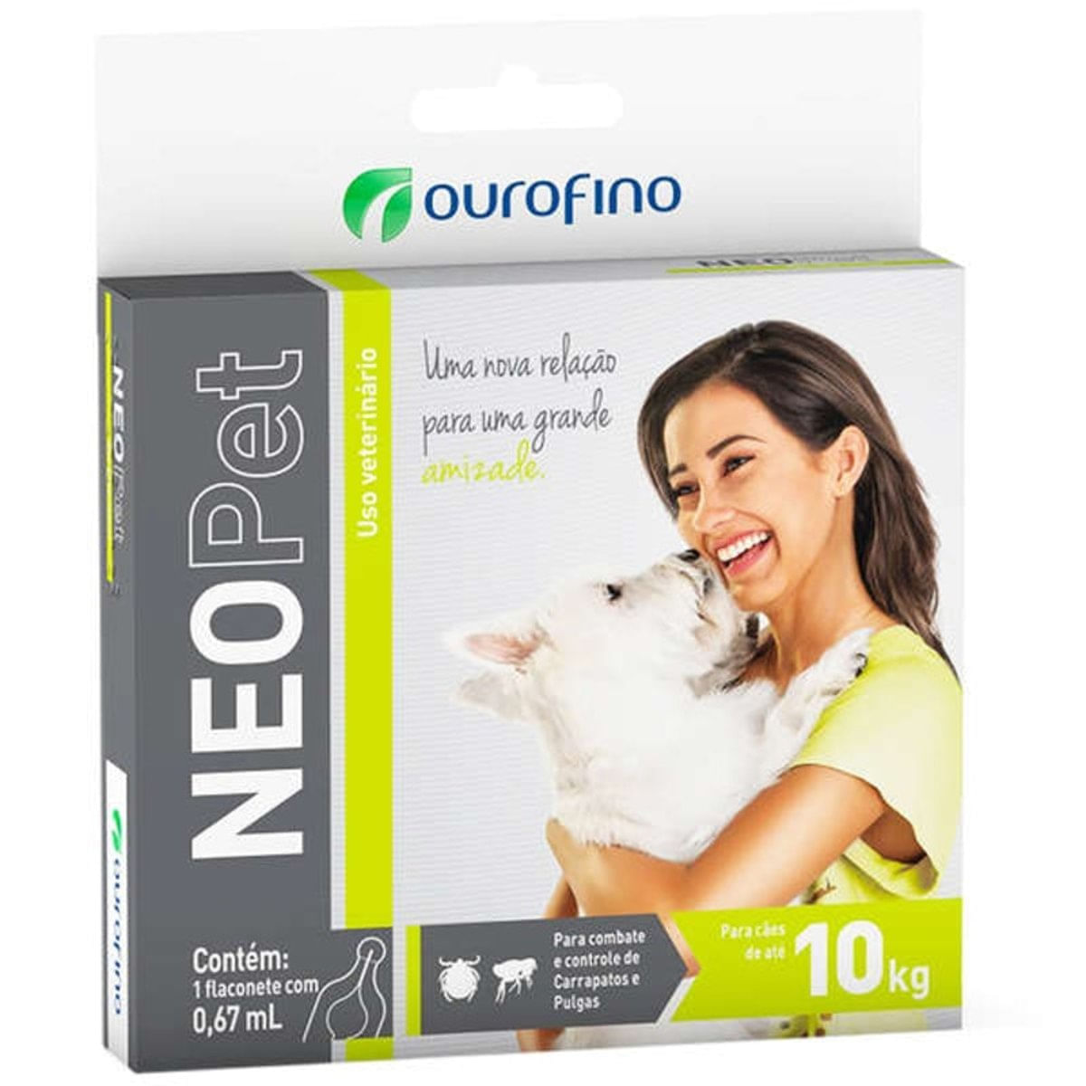 Características:..- Fácil aplicação,.- Eficaz e seguro,.- Auxilia no combate e controle de infestações de pulgas e carrapatos...Modo de usar:..Obedecer ao modo de aplicação do produto. Produto para aplicação em dose única. Não se recomenda o fracionamento de NeoPet, devendo ser utilizada a dose indicada para cada faixa de peso. Evite manusear o animal ou colocar coleiras até que o local de aplicação do produto esteja completamente seco..Duração de eficiência do medicamento: 30 dias..NÚMERO ANVISA/INMETRO: 9.733 em 01/07/2013.
