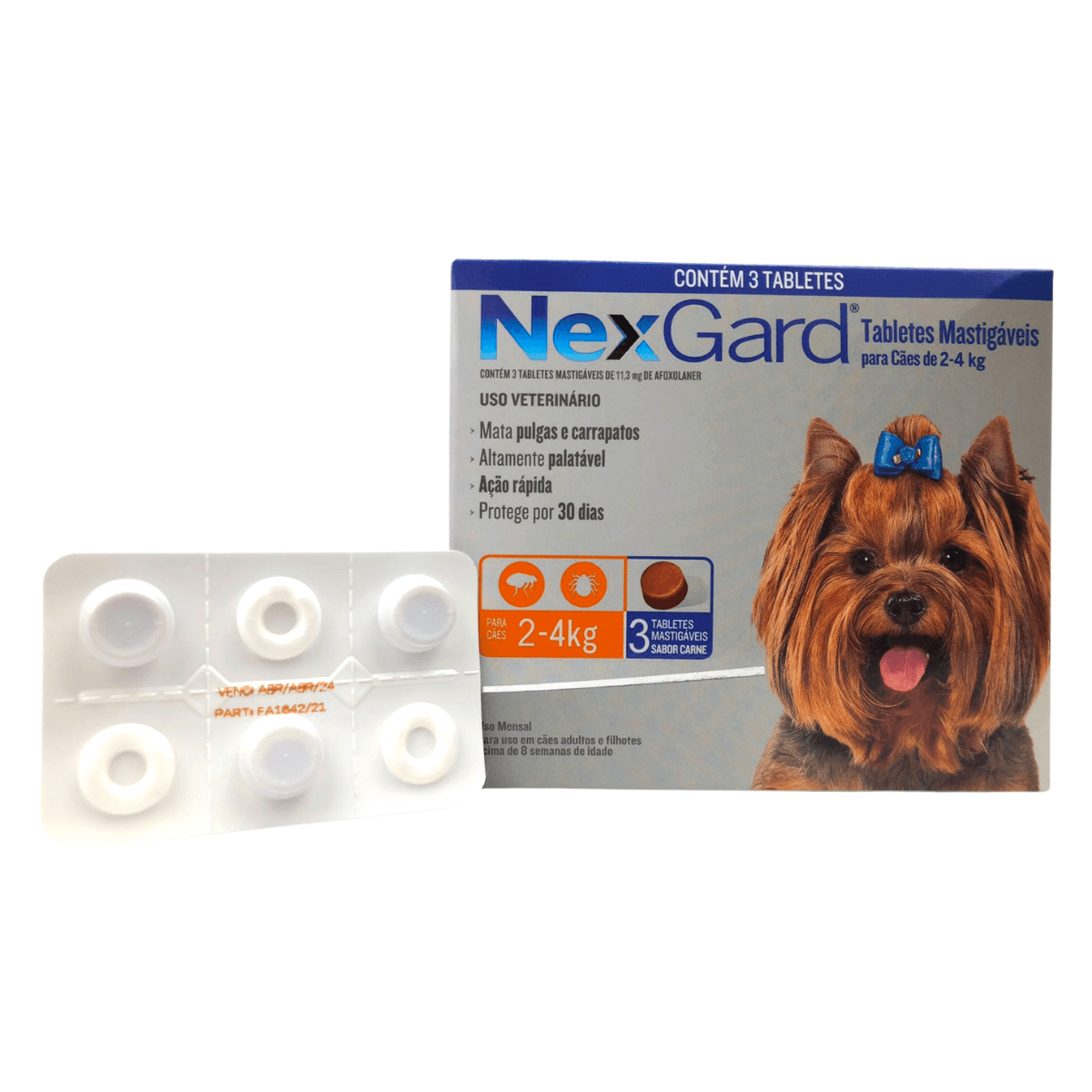 Nex Gard - Antipulgas e Carrapatos - Cães de até 4 kg com 3 tabletes..NexGard é a solução para o tratamento e prevenção mensal contra pulgas e carrapatos, unindo eficácia e segurança à facilidade de administração de um tablete mastigável e macio com um delicioso sabor carne. .INDICAÇÃO: NexGard é indicado para o tratamento e prevenção de infestações por pulgas e carrapatos em cães acima de 8 semanas e que pesem no mínimo 2kg. Nex Gard mata as pulgas entes que elas coloquem ovos..- NexGard deve ser administrado uma vez por mês,.- NexGard é altamente palatável e fácil de administrar,.- NexGard tem um rápido início de ação e atinge 100% de eficácia em 8 horas,.- NexGard controla rapidamente a reinfestação de pulgas adultas recém-adquiridas e carrapatos por um mês...IMPORTANTE: Para minimizar a probabilidade de reinfestação por pulgas e carrapatos, é importante tratar todos os animais que convivem no mesmo ambiente. E para acelerar a eliminação total das pulgas e carrapatos, pode-se fazer um controle estratégico integrado no ambiente onde os animais vivem....O Médico Veterinário sempre deverá ser consultado sobre uso de medicamento em seus Pets.