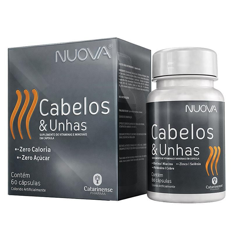 Nuova Cabelos E Unhas Biotina Catarinense 60 Cápsulas..Suplemento de vitaminas e minerais Nuova Cabelos e Unhas possui nutrientes que contribuem para manutenção do cabelo, pele e unhas: como as vitaminas Biotina, Niacina, Piridoxina e os minerais cobre, zinco e selênio..Zero caloria, zero açúcar e não contém glúten...Ingredientes Nicotinamida, Óxido de Zinco, Cloridrato de Piridoxina, Sulfato de Cobre Anidro, Selenito de Sódio e Biotina. Veículos: Celulose Microcristalina (460i) e Colágeno Hidrolisado. Lubrificante: Estereato de Magnésio Vegetal (INS 470iii). Antiumectante: Dióxido de Silício (INS 551). Gelificante: Gelatina (INS 428). Corantes: Dióxido de Titânio (INS 171), Quinoleína (INS 104) e Amarelo crepúsculo (INS 110). Acidulante: Ácido acético (INS 260). marca:Catarinense Pharma