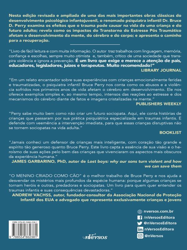 O Que Acontece Quando O Cérebro Infantil Sofre Um Único Evento Traumático Ou A Exposição Prolongada A Um Trauma? Como O Terror, A Ameaça, O Abuso Ou A Violência Afetam A Mente De Uma Criança? E Como Essa Mente Pode Se Recuperar? O Psiquiatra Infantil Dr. Bruce D. Perry Ajuda Crianças Que Enfrentaram O Horror Inimaginável: Sobreviventes De Genocídio, Testemunhas De Assassinatos, Adolescentes Sequestrados E Vítimas De Negligência, Abuso E Violência Familiar. Em “o Menino Criado Como Cão”, O Dr. Perry Nos Apresenta Em Detalhes Os Eventos Que Levaram Alguns De Seus Vários Pacientes A Lidarem Com Traumas Terríveis E A Desenvolverem Dificuldades Ao Longo Da Juventude, Revelando A Surpreendente Capacidade De Cura Do Cérebro. Combinando Habilmente Histórias De Casos Inesquecíveis Dos Seus Pacientes Com Suas Próprias Estratégias Compassivas E Perspicazes De Reabilitação, perry Explica O Que Exatamente Acontece Com O Cérebro Quando Uma Criança É Exposta A Um Estresse Extremo, Revelando As Medidas Inesperadas Que Podem Ser Tomadas Para Aliviar A Dor De Uma Criança Seriamente Traumatizada e Ajudá-la A Crescer E A Se Tornar Um Adulto Saudável. Como Membro Sênior Da The Child Trauma Academy/academia Do Trauma Infantil, O Dr. Perry E Sua Equipe Clínica Multiprofissional Assistiram, Com Incrível Resiliência, Persistência E Determinação, Milhares De Pessoas Que Sofreram Graves Negligências E Abusos Na Infância. Por Meio Da Sua Experiência Com As Histórias De Crianças Que Se Recuperam Fisicamente, Mentalmente E Emocionalmente Das Circunstâncias Mais Devastadoras Que Possam Existir, Perry Mostra Como Coisas Simples (o Ambiente, O Afeto, A Linguagem E O Toque, Por Exemplo) Podem Impactar Profundamente O Cérebro Em Desenvolvimento, Tanto Para O Bem Quanto Para O Mal. Neste Livro Comovente, O Dr. Bruce Perry Demonstra Dramaticamente Que, Somente Quando Entendemos A Ciência Da Mente, Podemos Curar A Alma Até Mesmo Da Criança Mais Ferida.