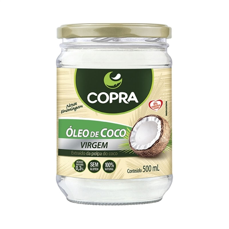Óleo de Coco virgem Copra pode substituir demais óleos na cozinha, pois é um produto com capacidade de suportar altas temperaturas sem sofrer modificação em seus componentes nutricionais. Por isso, ele é considerado um óleo estável, além de mais saudável, pois não apresenta gordura trans, que é gerada pelo processo de hidrogenação, presente na maioria dos óleos de origem vegetal. Assim, o Óleo de Coco Virgem pode ser usado em refogados, saladas, vitaminas e na alimentação cotidiana em geral...É extraído da fruta fresca, prensado a frio, não passando por nenhum tipo de refinamento, logo é um produto 100% natural e livre de agrotóxicos...Embalagem de vidro com 500ml...Produto dispensado de registro no Ministério da Saúde conforme RDC nº 27 de 06 de agosto de 2010.