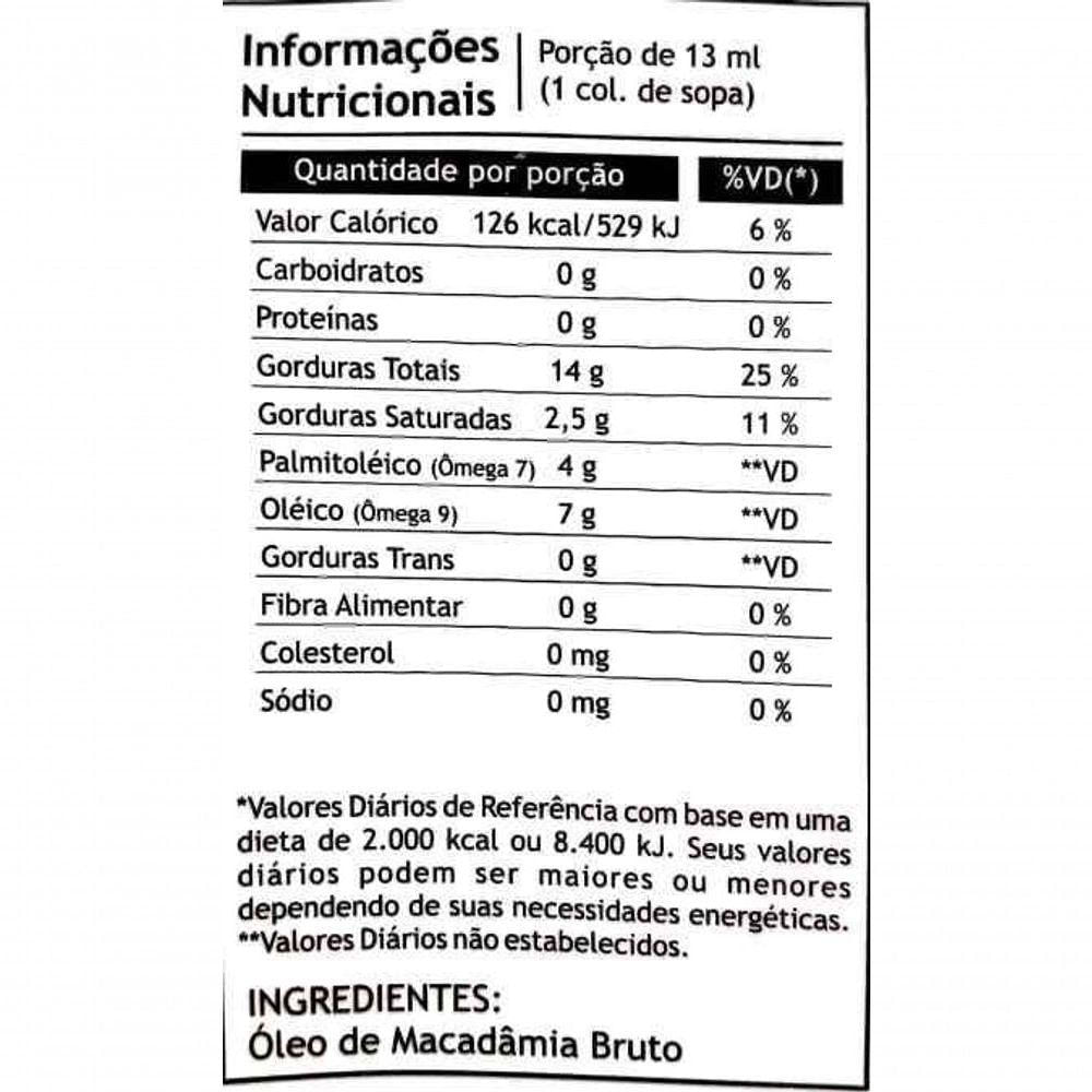 Óleo De Macadâmia Extra Virgem Pazze 250mlóleo De Macadâmia Extra Virgem Pazze 250mlsobre O Produtoas Macadâmias São Consideradas As Nozes Mais Finas Do Mundo, Não Contém Colesterol, Pois É Um Alimento Vegetal Natural, Não São Geneticamente Modificadas E Contém Apenas Genes Naturais, Não Possuem Quaisquer Ácidos Graxos Trans E Contém Niveis Significativos De Proteínas. Possui Grandes Quantidades De Ácidos Graxos Insaturados, Principalmente Ômega 7 E 9.modo De Usarutilizar Na Preparação De Saldas E Na Preparação De Pratos Especiais, Ou Conforme Orientação Profissional.ingredientesóleo De Macadâmia Bruto.
